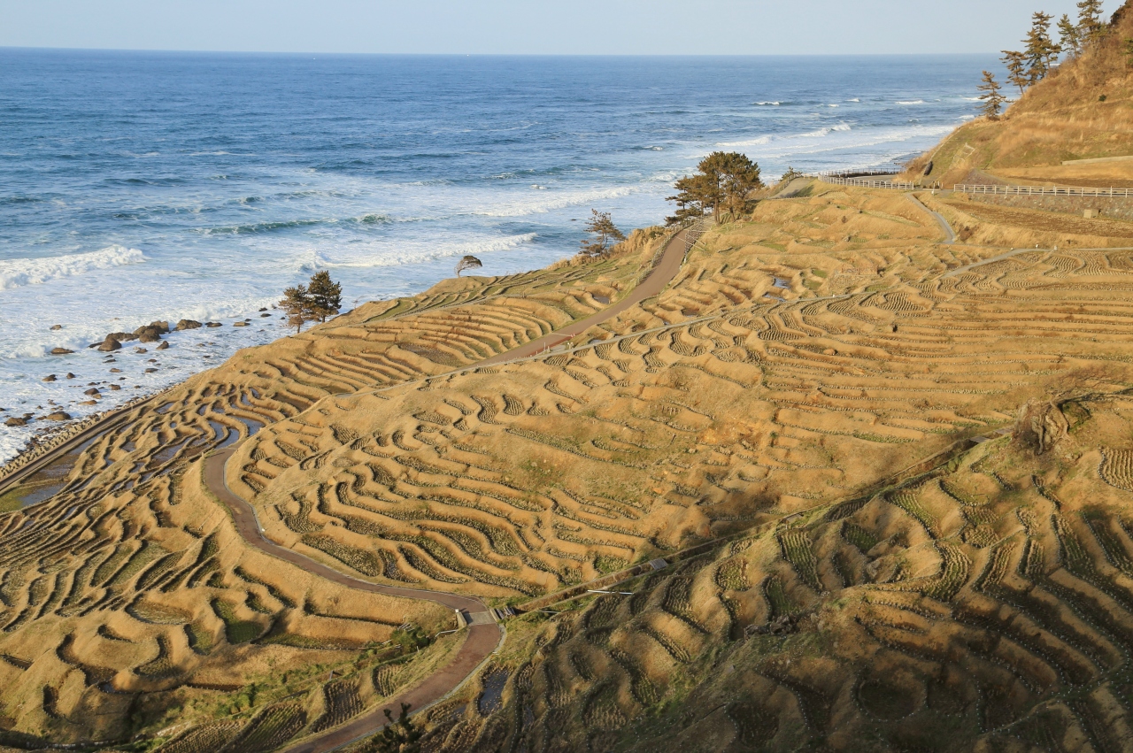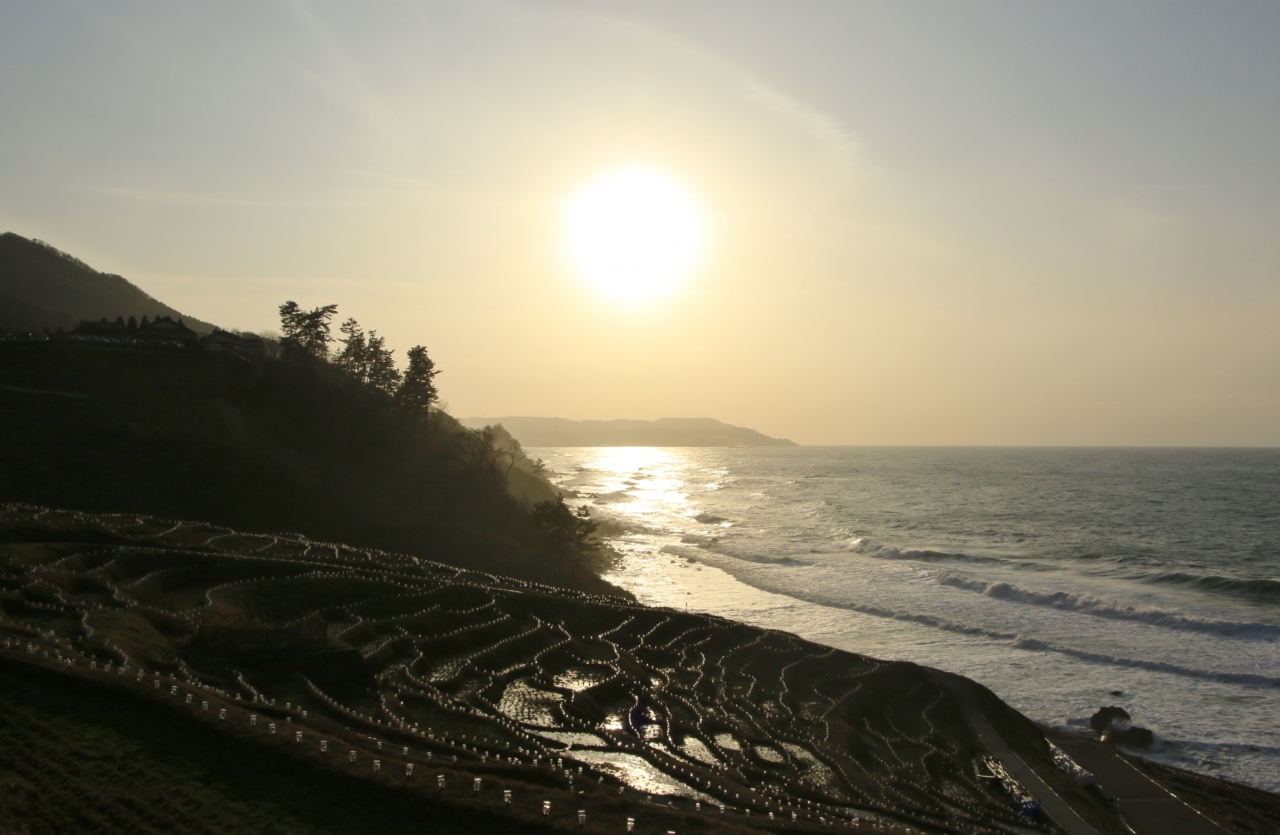 千枚田の名の通り、1004ある小さな田んぼが海に向かって広がっている棚田の風景は圧巻です。道の駅「千枚田ポケットパーク」に棚田と日本海を見渡せる展望台がありますが、田んぼの中も散策できるように遊歩道が整備されています。遊歩道からは棚田ごしに夕日が見られ、田んぼに水が張られていると陽の光がキラキラと反射してそれはそれは美しい景観です。展望台からの風景だけでなく散策路も歩いてみられることをお勧めします。