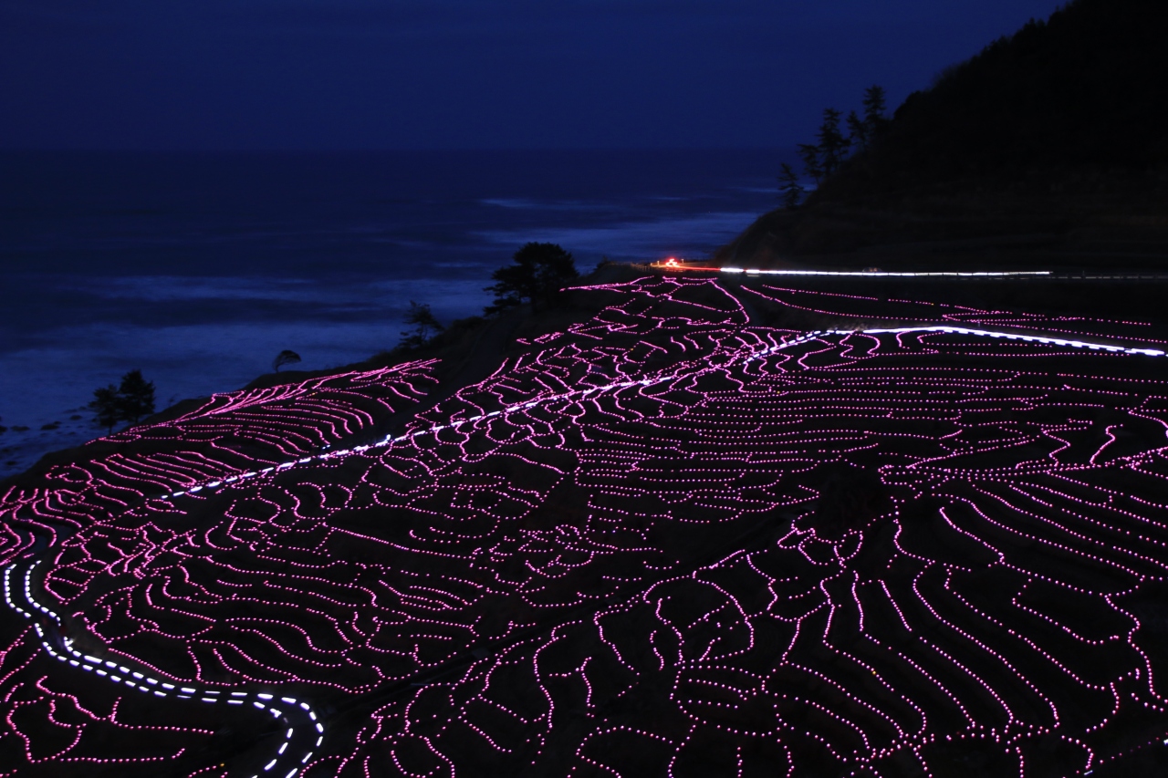 冬場に開催されるLEDライトによるライトアップ「あぜのきらめき」が見たくて行きました。天気が良く夕陽も見られそうだったので16時くらいに到着。見事な景観を前にして散策と写真を撮るのに2時間も滞在してしまいました。
