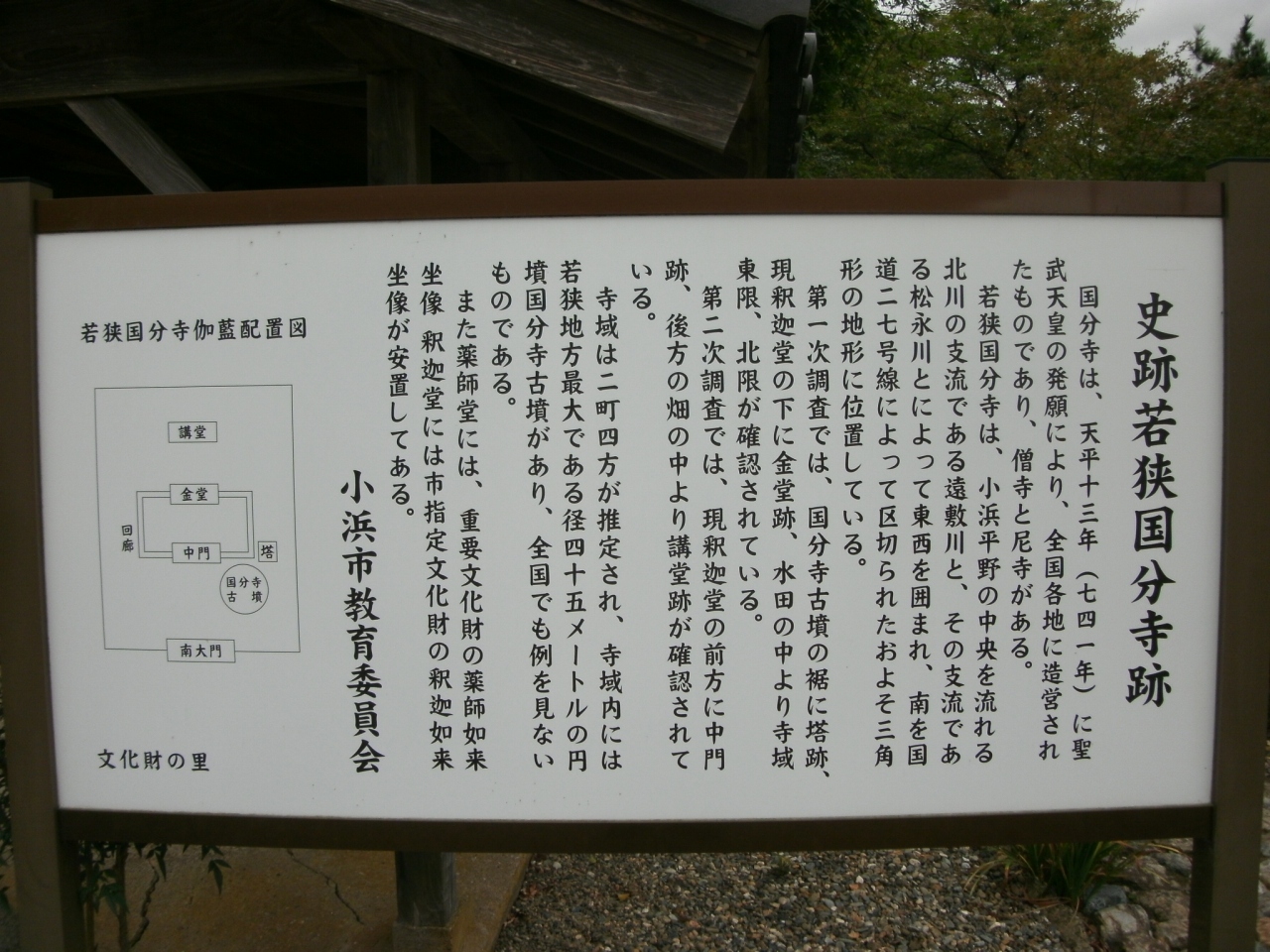 発掘調査によって、南大門、中門、金堂などの遺構が確認され、国指定史跡となっています。現地にある説明版には、寺域は2町四方(約200m)あったということなので、壮大なお寺だったことはなんとなくわかりました。