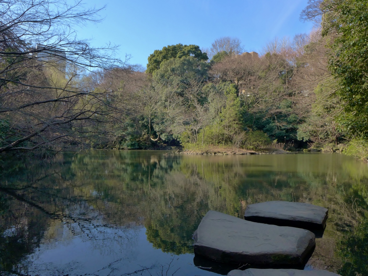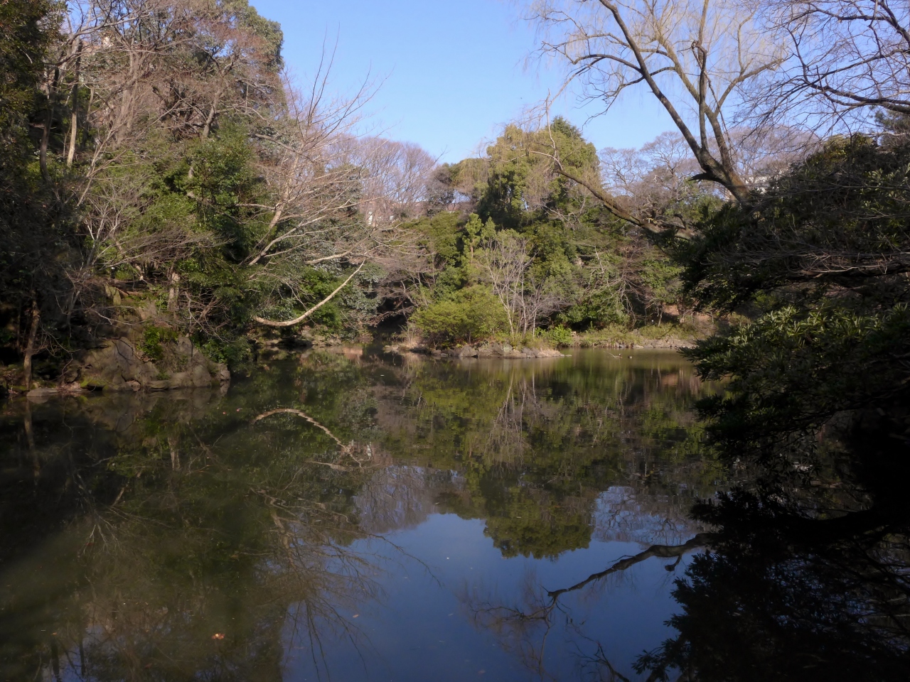 たくさんの樹木に囲まれた池で、思ったよりも大きいです。都会とは思えない深山幽谷のような空間です。 池の周囲には遊歩道がありますが、一周すると結構な上り下りがありました。