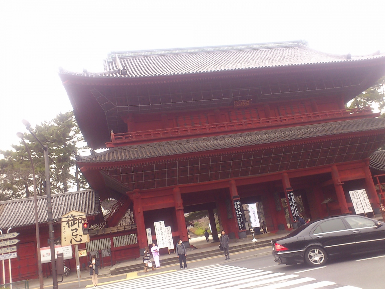 増上寺の正門です。大門を潜ると横断歩道の向こうに赤い大きな門が見えてきます。バックには東京タワーが見えます。入口が3つあります。とにかく重厚感が漂う素晴らしい門で、この門だけでも増上寺の立派さを表している感じがします。