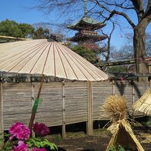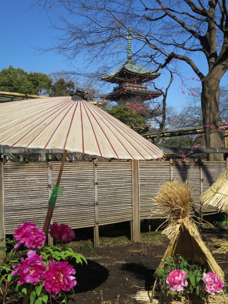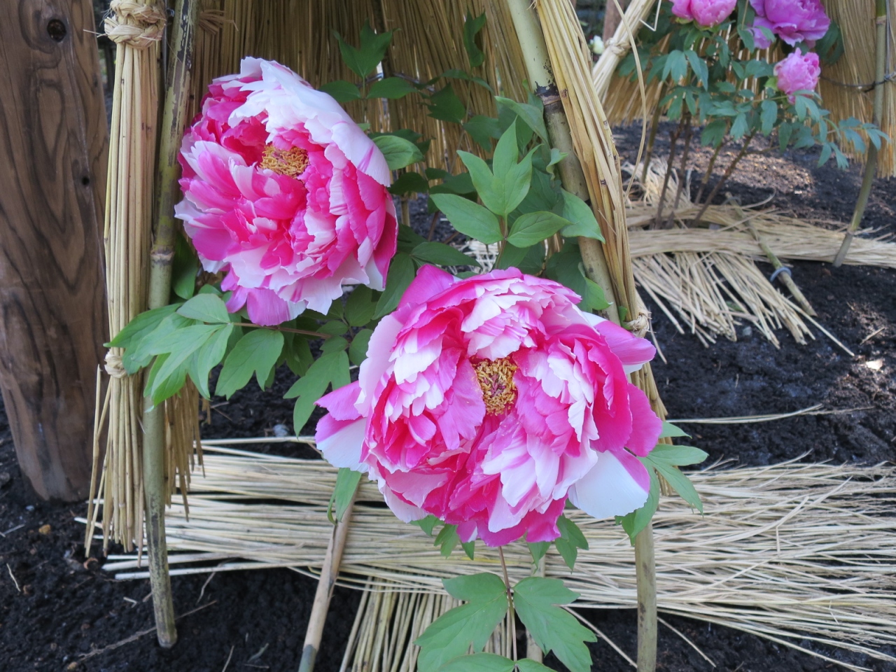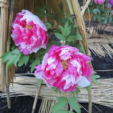 赤、ピンク、白そして黄などの花々が菰を被りながらも艶を競っていました。願わくば菰に似合う雪が降ったときに訪れたかったのですが、五重塔を背景に眺めるぼたんも絵になります。苑内には休憩所もあり、お抹茶などをいただきながら、ゆっくり眺められる場所も順路の終盤にあります。きれいなぼたん娘のお姉さんが案内をしていました。