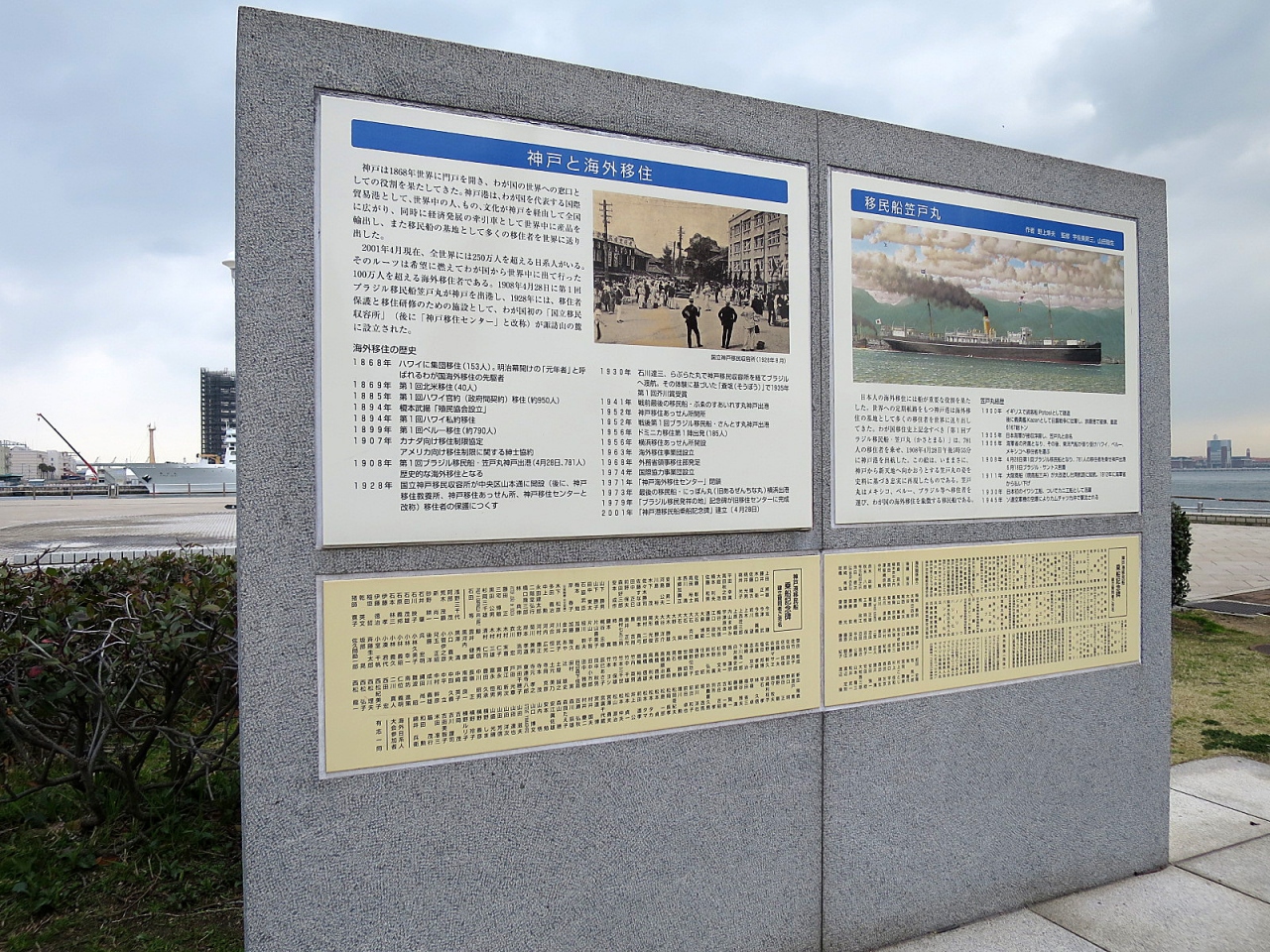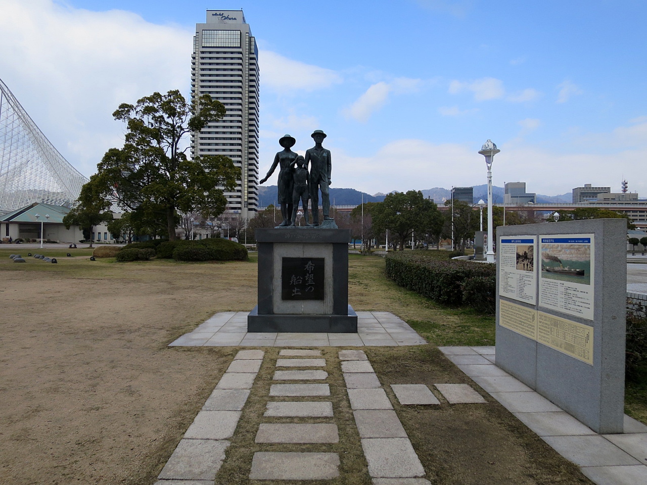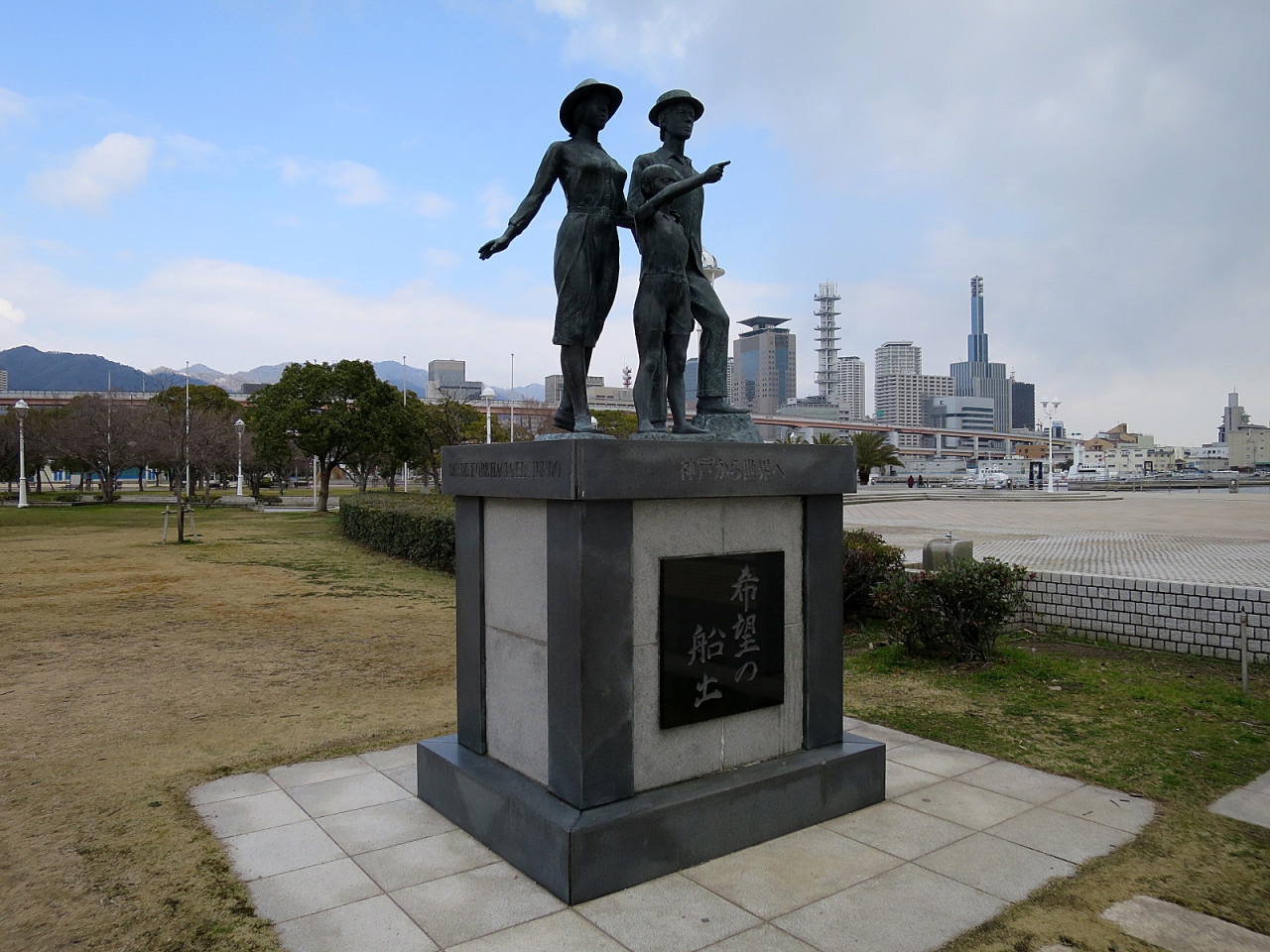 「メリケンパーク」内にある「希望の船出」という彫刻がありました。明治41年、神戸からブラジル移住者を乗せた「笠戸丸」が出港したのを初めとし、約25万人もの人々が 神戸港 からブラジルへ移住したことを記念して建てられたものということです。江戸から明治へと時代が大きく変わる中、職を失った旧士族層、対外戦争によって働き手を失った家族など、激動する社会の犠牲者たちが豊かさを夢見て旅立った記念碑なんですね。まだまだ貧しかった頃の日本に生きた人々を思い浮かべ、自分自身の今後をも考える機会になりました。