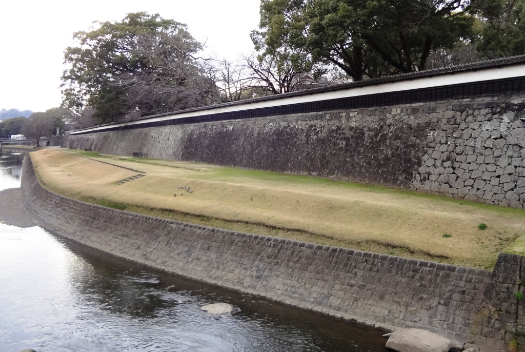 熊本城の名物の一つに「長塀」があります。巨大な石垣の上に続く白の漆喰壁に屋根が乗った塀で、長さ242メートルもあり現存する城郭の中では最長だそうです。実はこれまで「長塀」は「長堀」だと思い込んでました。行幸坂から見ると、堀の大きさと石垣のすごさに気を取られていたのです。でも、あれは堀というより流れのある川(坪井川です)。再訪して人工の構造物として意味がありそうなのは、石垣とその上にある塀だと初めて気づいたのです。ただ、対岸の長塀通りから見ると、目立つのはやっぱり石垣。塀はその上にちょこんと乗ってるようにしか見えません。撮影した画像を拡大して「ありゃ、こりゃすごい」と思った次第でした。20年ちょっと前の台風では、140メートルも倒壊。修復したものの、旧状には戻せなかったというエピソードもあるそうです。