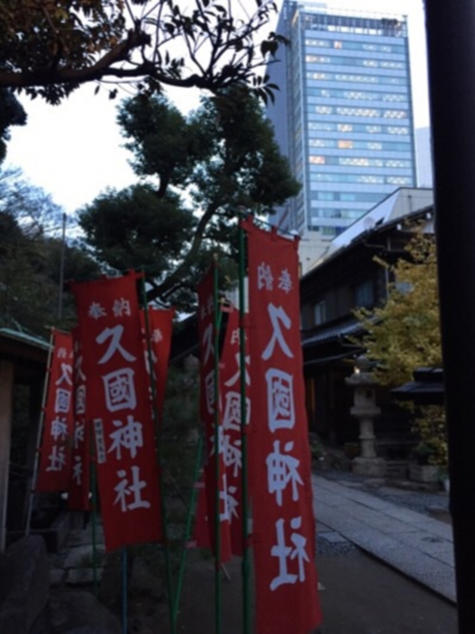 1457年に太田道潅の江戸築城に際し、溜池に遷座したようで、道灌が久国作の刀を寄進したところから、久国稲荷と称するようになったと言われています。