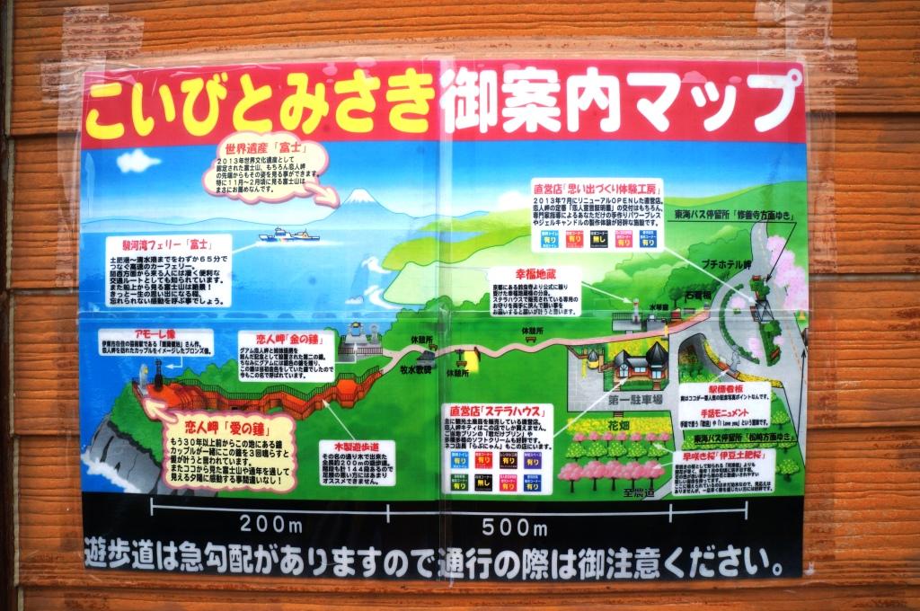 恋人岬は、土肥温泉から数km国道を南下したところにある景勝地です。駐車場から遊歩道を歩いていくと海と富士山の景色がすばらしい展望台があって、そこには鳴らすと愛を呼ぶという鐘があります。駐車場横には売店があり、お土産やと地元の格安な農産物も売っています。