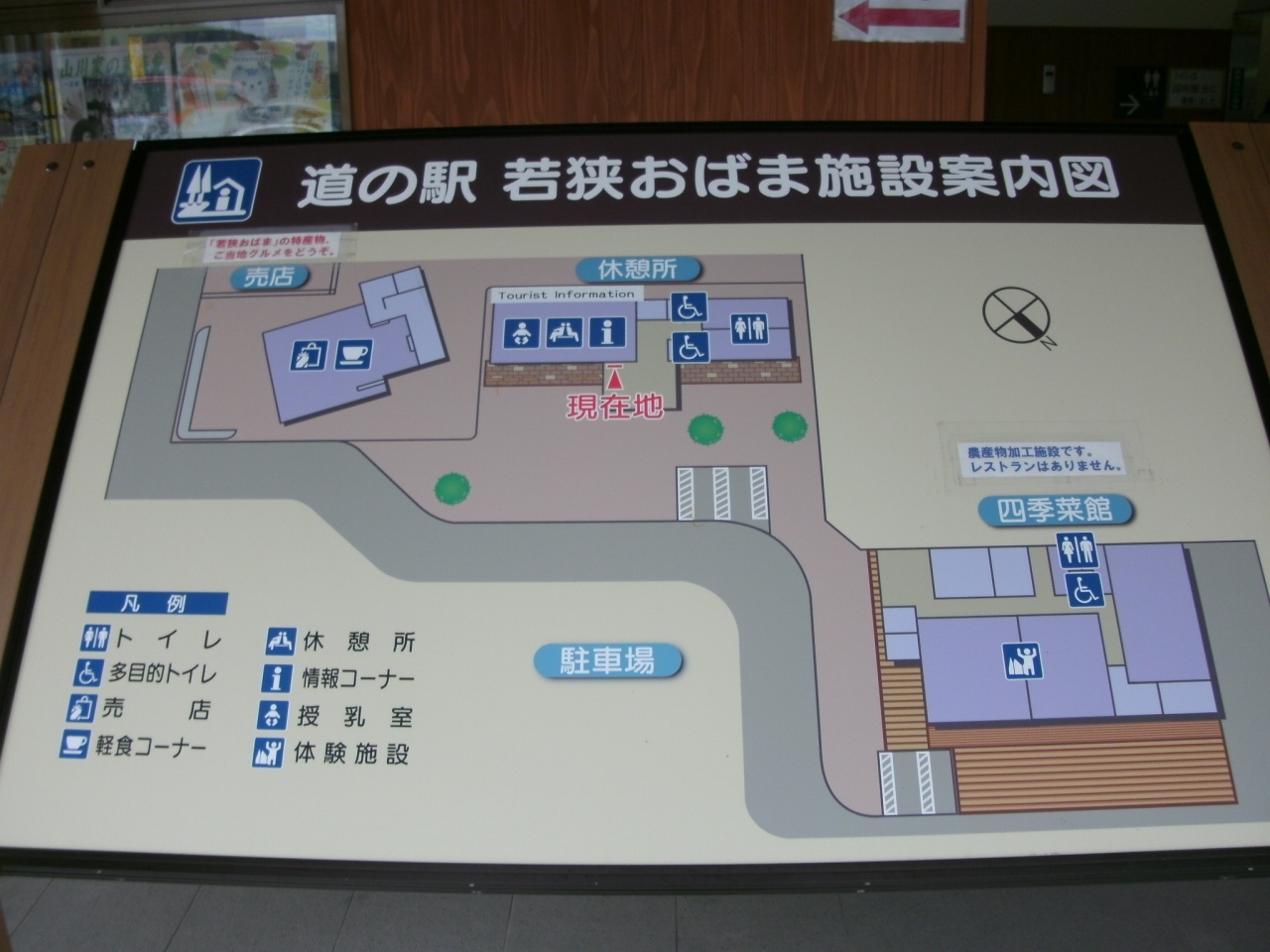 売店と休息施設からなり、売店には若狭小浜の特産・名産品やお土産物、野菜・果物、浜焼き鯖・へしこ・ささ漬けなどの魚の加工品などが販売されていて、練り物の天ぷらやアイス、カレーなどが頂けるフードコーナーがありました。