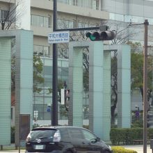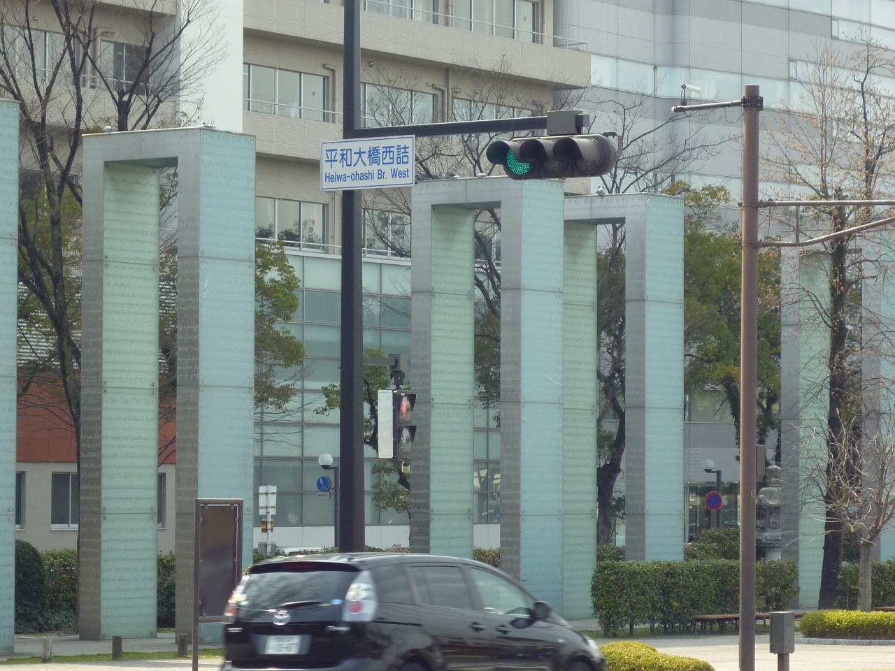 平和大通りに1列に10基のガラスの門が並んでいます。被爆60周年を機に制作され、広島市に寄贈されたそうです。門をよく見ると、文字が刻まれていました。世界49か国の言葉で、「平和」の文字が刻まれていました。記憶と希望の「かけはし」を表現しているそうです。