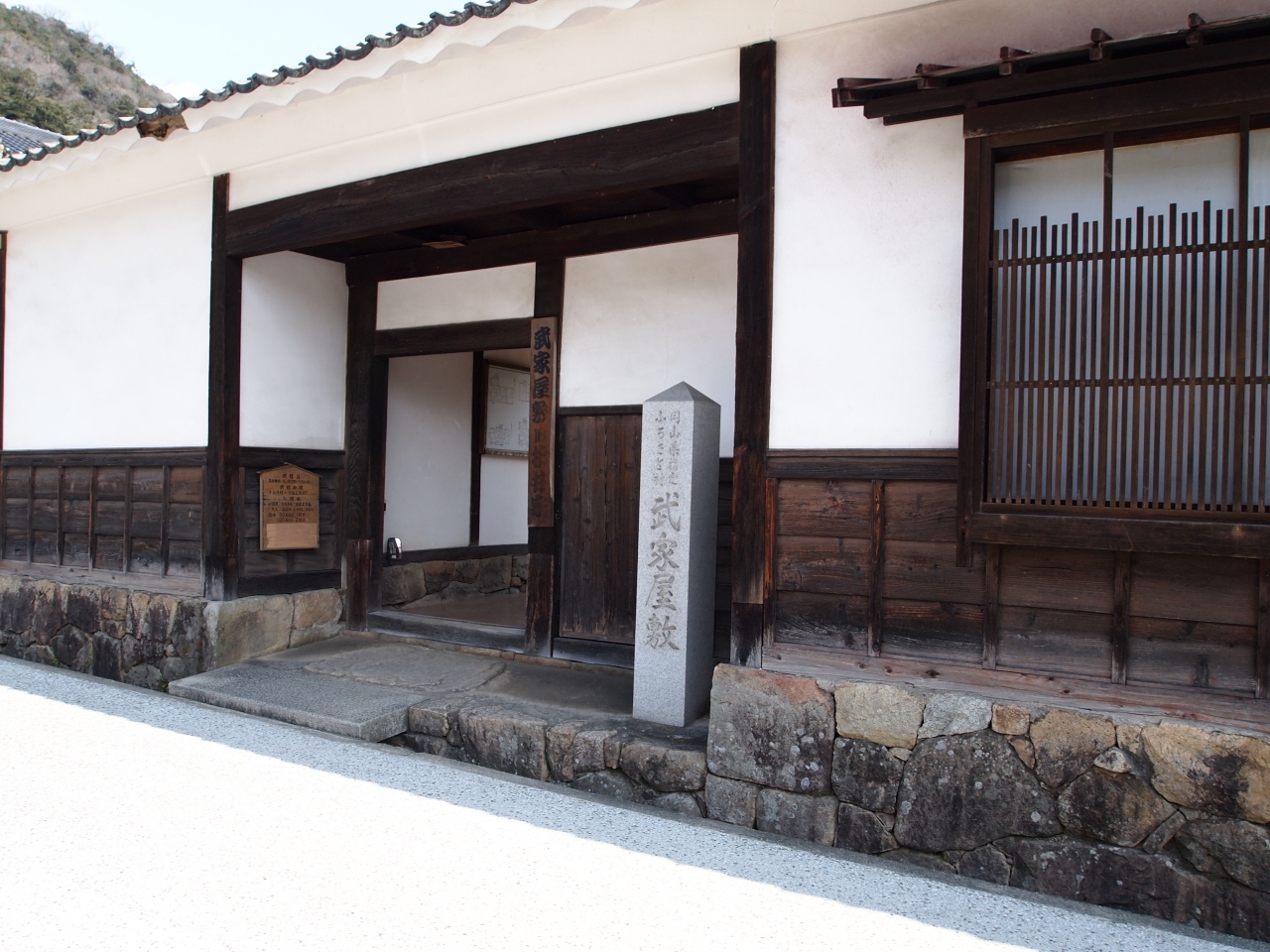 御殿のあった高梁高校の前から続く道は、電柱もなく、両側に、白壁の長屋門や土塀の連なる武家の町です。武家屋敷も公開されていて、武家の住いが詳細に再現されています。無料の駐車場がありますので、ここから頼久寺や、紺屋川まで、近いですから、のんびり散策され、商家資料館で休憩して戻られるのがいいでしょう。