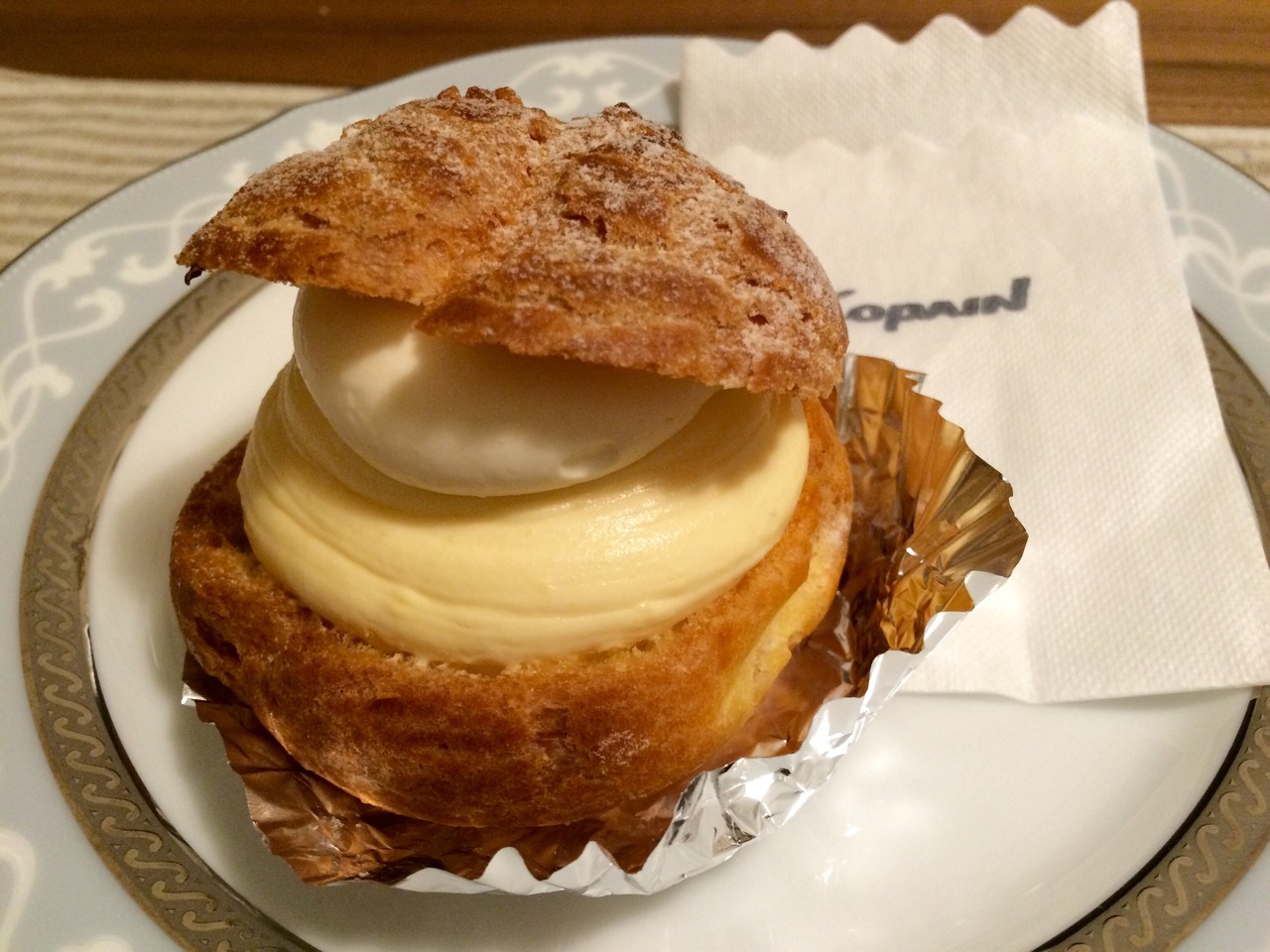 ひとつが250円のシュークリームをテイクアウト。2層のクリームはたっぷりですが優しい甘さでしつこくなく、クッキーのようにサクサクのシューとマッチしていておいしかったです。