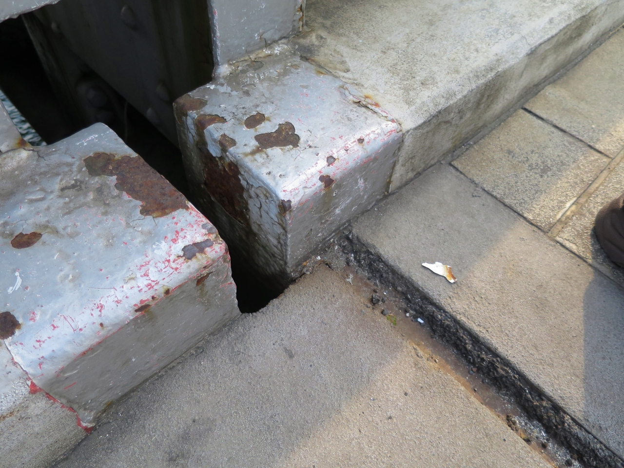 跳ねあげ部の端から橋の下を見下ろすと、川の流れが見えてしまう。