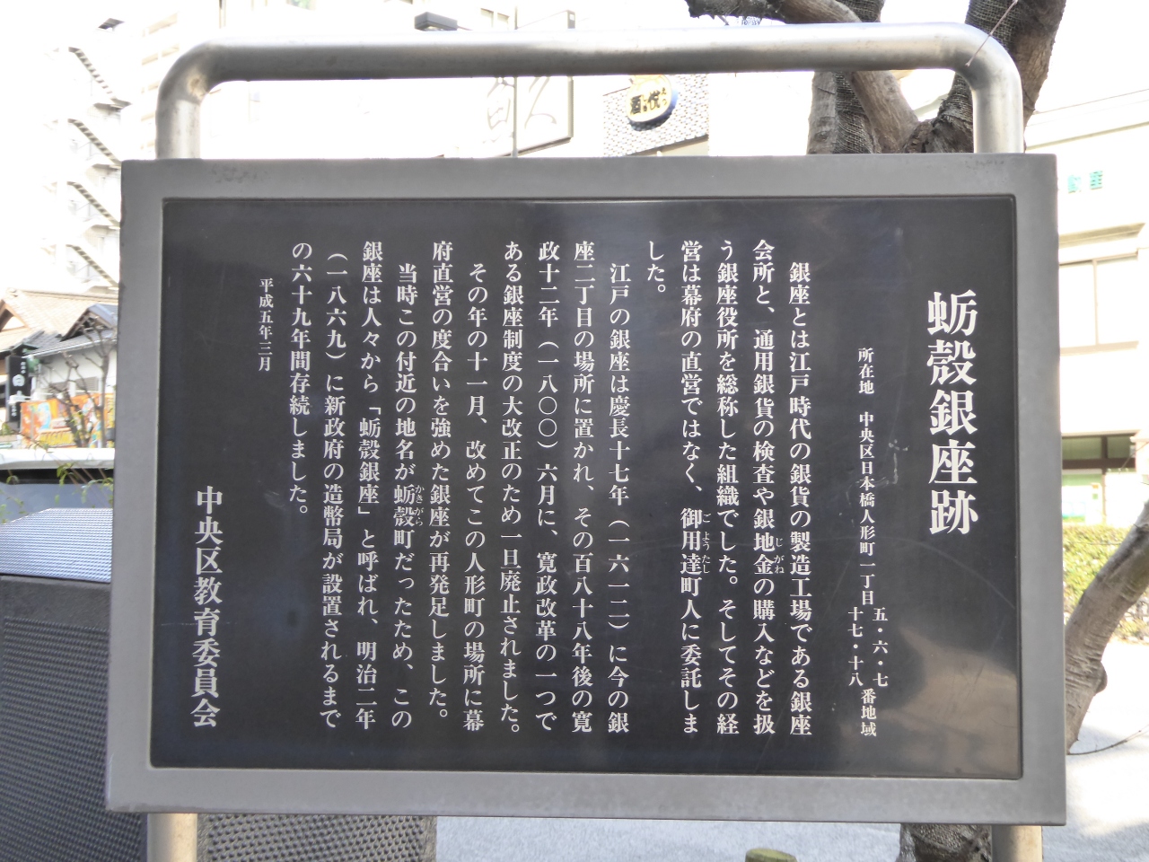 今日の銀座二丁目に銀貨鋳造所である「銀座」が開かれてから約200年後、幕府は銀座の組織改革を行い、座人の御役取放を命じ、享和元年(1801年)日本橋蛎殻町に銀座を移しました。