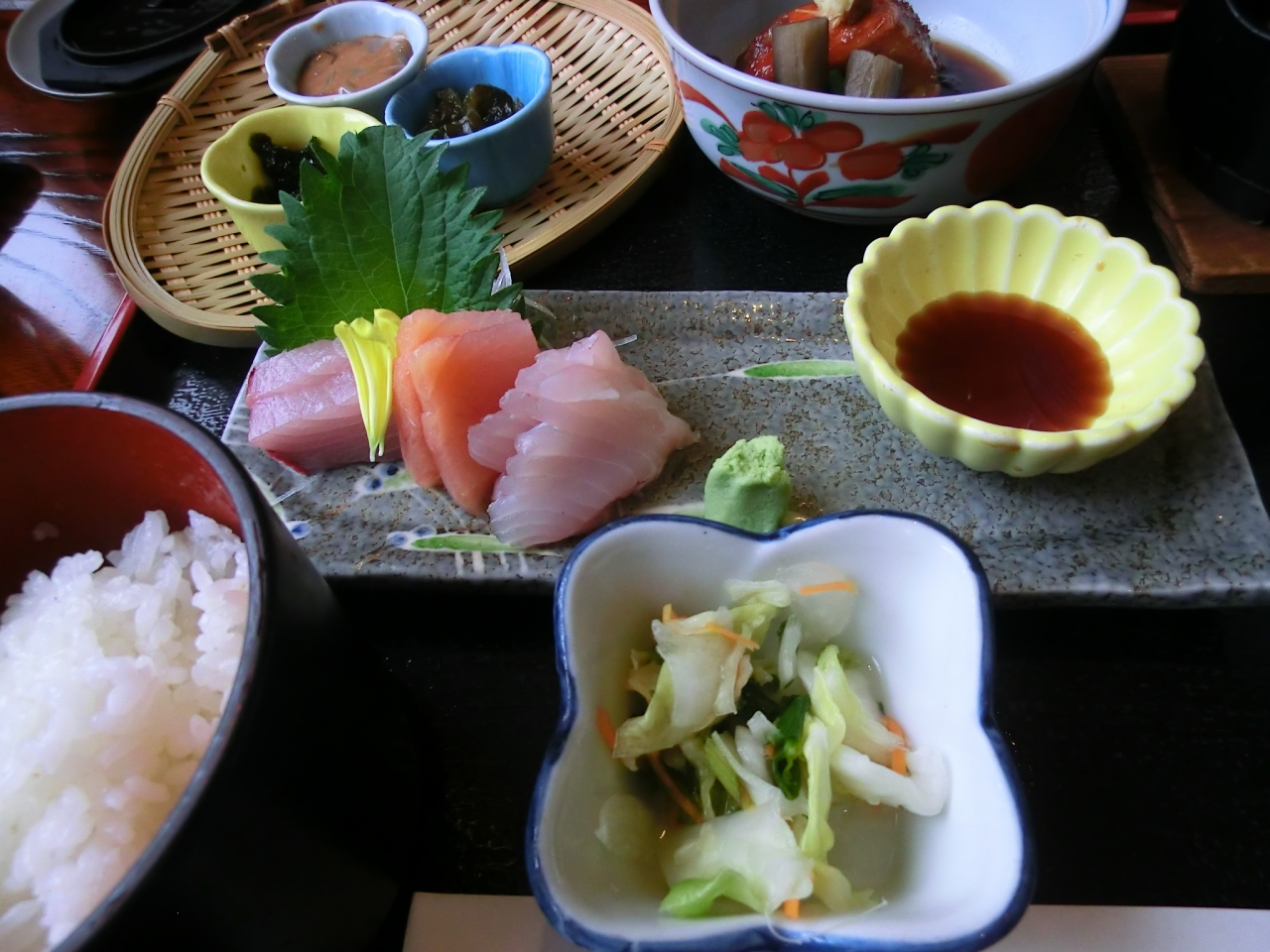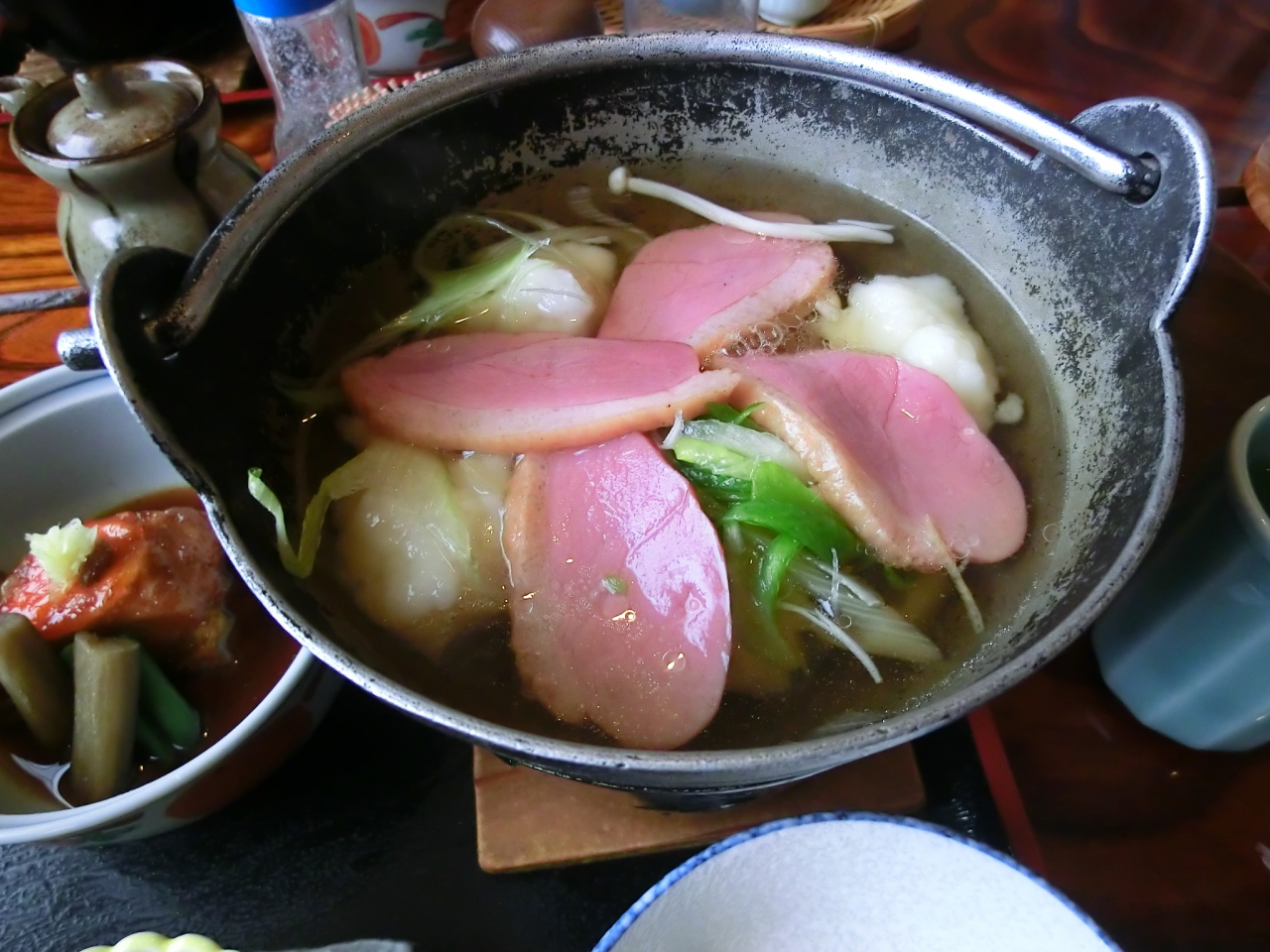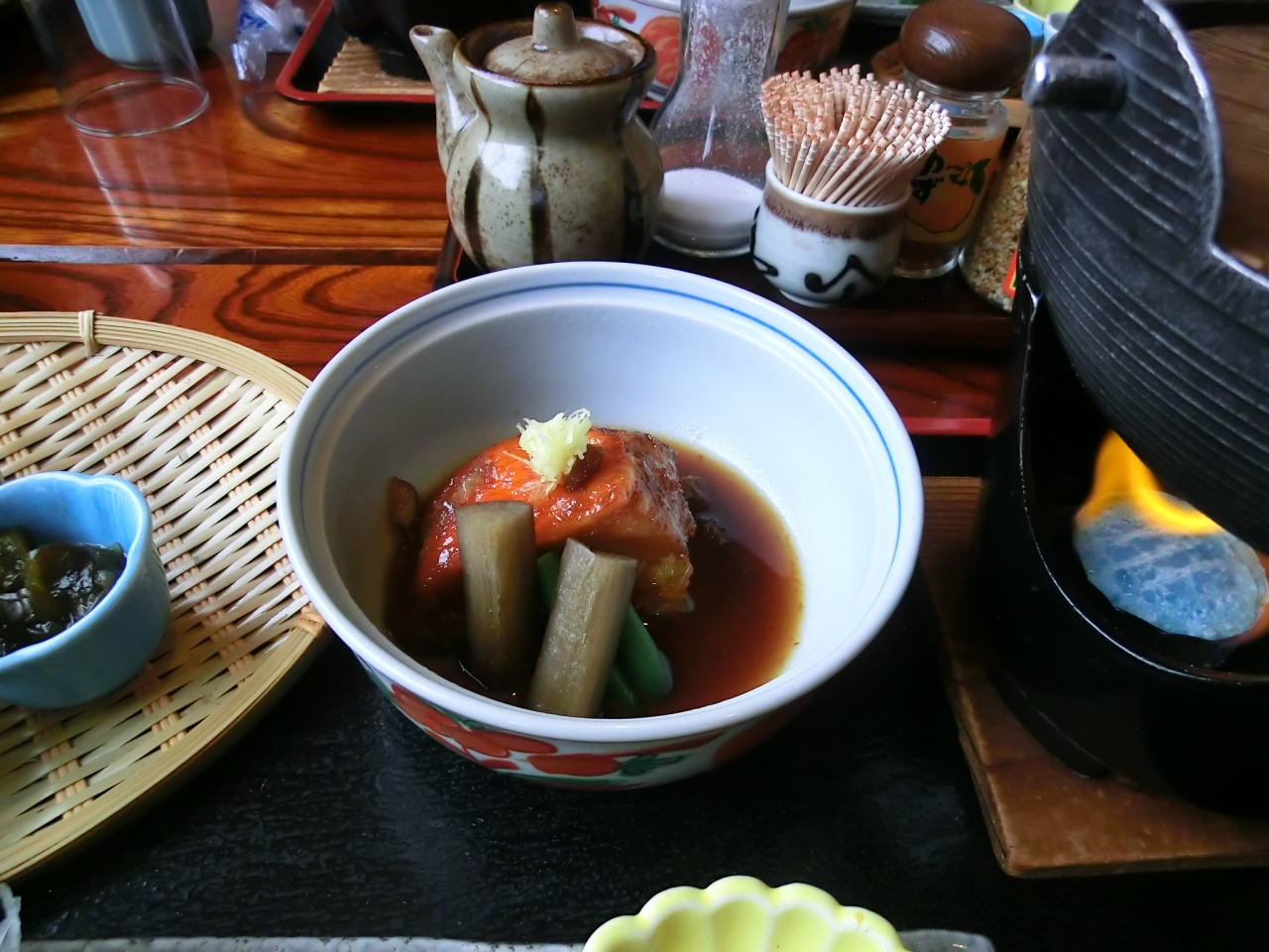 最初に威勢のいいお兄さんがお料理の説明をしてくれました。私たちが食べたのは「ひいな膳(要予約)」です。濃い味の金目鯛の煮付け、鴨のすいとん鍋、お刺身、小鉢の一つ一つに至るまでおいしく、このお店が人気の訳がわかりました。小鉢のイカの塩辛や岩のりはお店で販売もしているそうです。