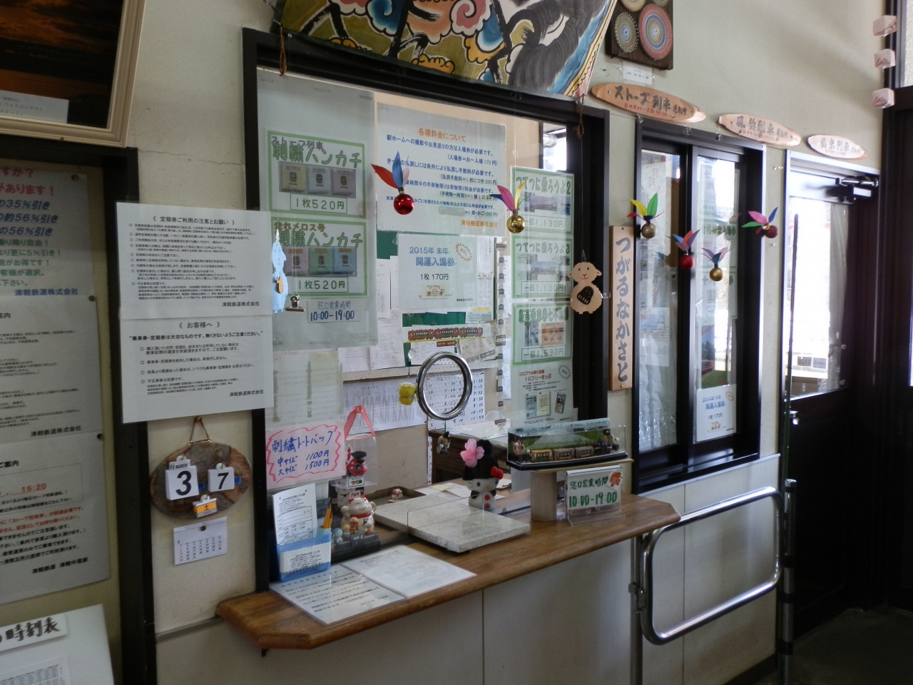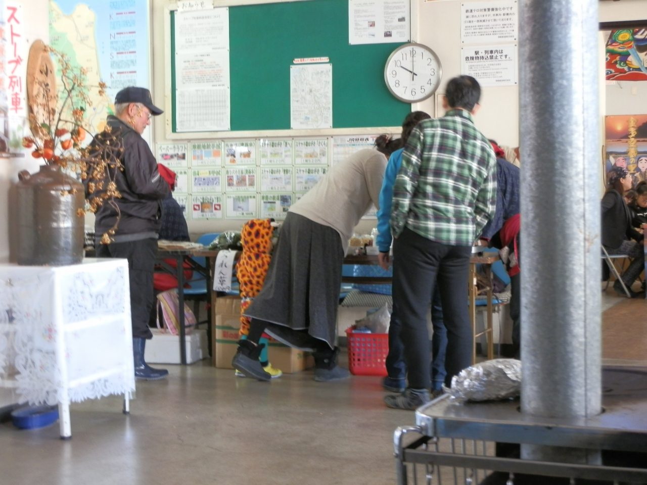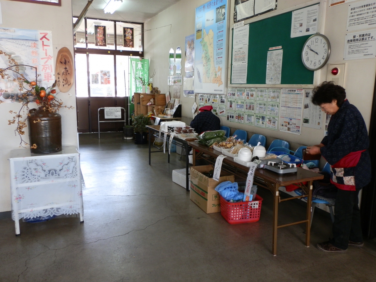 出札窓口の通路では、おにぎり、弁当などを売る店が所狭しと営業していた。その前に待合室があり、中央にストーブがある。それに手をかざしながら世間話をする数人の地元の人がいた。
