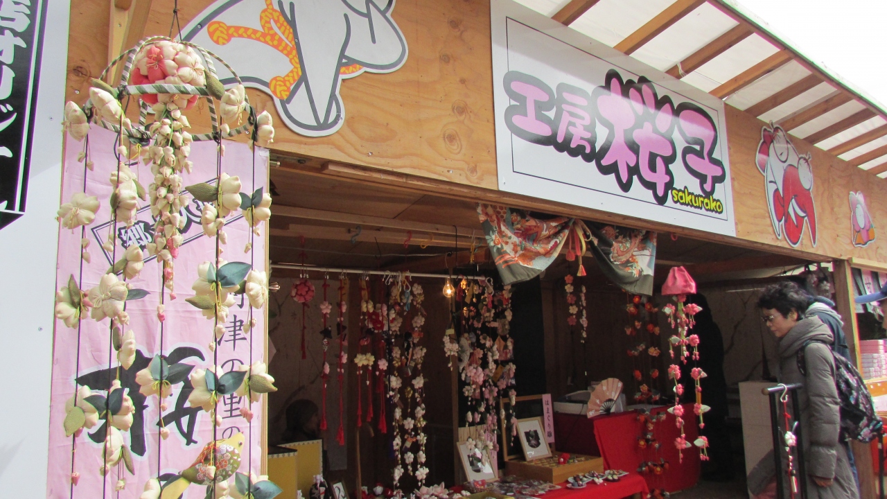 期間中毎日約150軒の出店が並びます。地場産品や露店ならではの食べ物が並び、花見と一緒に買物が楽しめます。