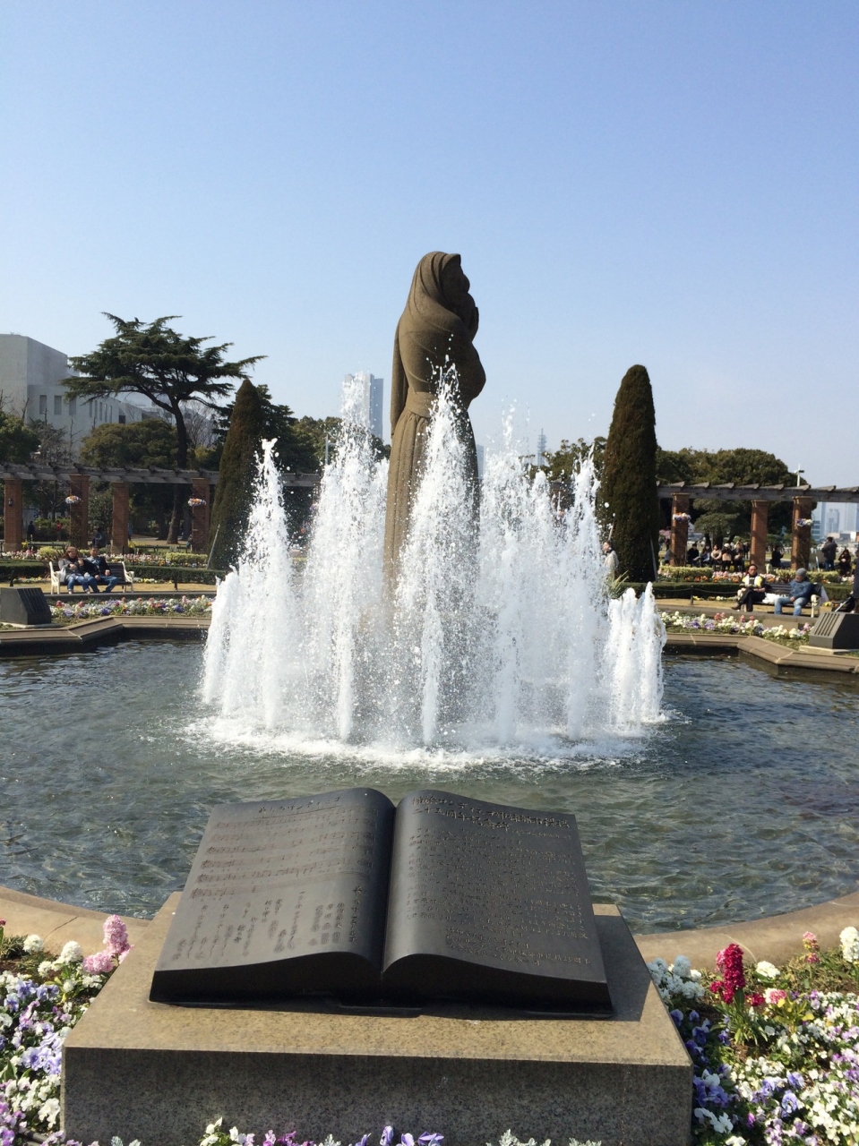 水の守護神像は横浜市と姉妹都市にあたるアメリカサンディエゴ市から寄贈されたものです。山下公園の中央入口から入った広場にあります。像を囲むように噴水が設けられ、そのまわりに花壇とベンチが置かれた憩いの場所です。これからの季節には涼をとるのにうってつけの場所だと思います。真夏には日陰がなくて暑いかもしれませんが。