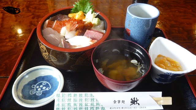 羅臼の流氷観光の後、ウトロまでのバスの時間まで十分に食事をする時間があり、海沿いの町ということで海鮮系の店を選択。とりあえず一度にたくさんのネタが楽しめる海鮮丼を注文。鮮度の良いネタはおいしく、ボリュームがあったので満足。小鉢が付いているのもうれしい。