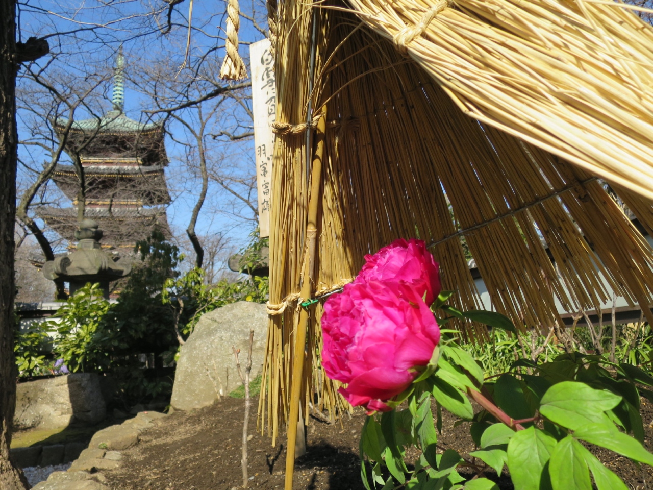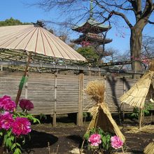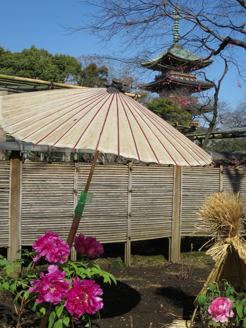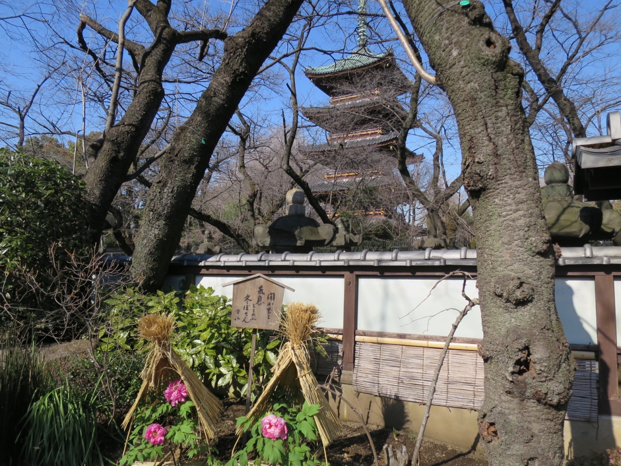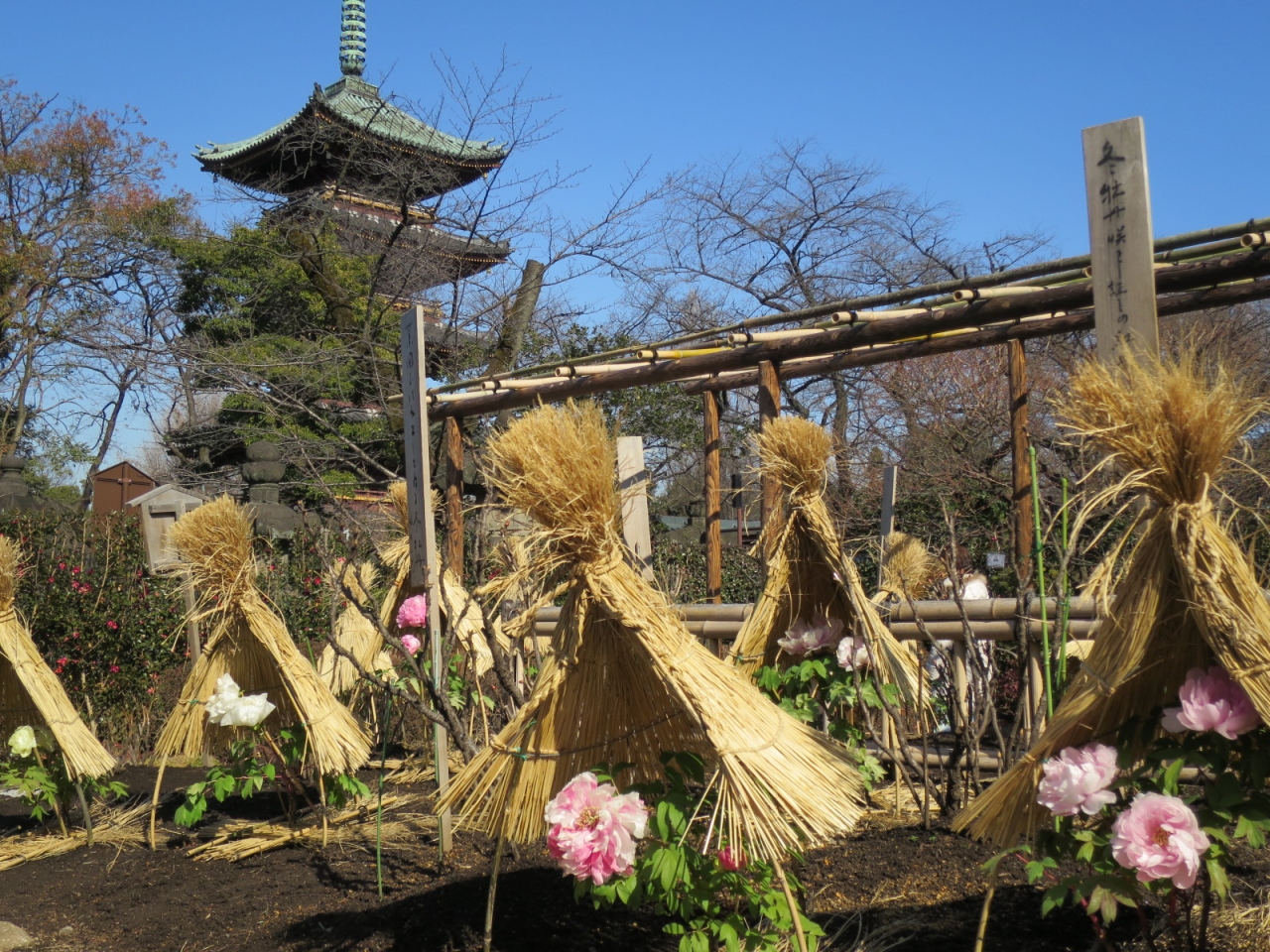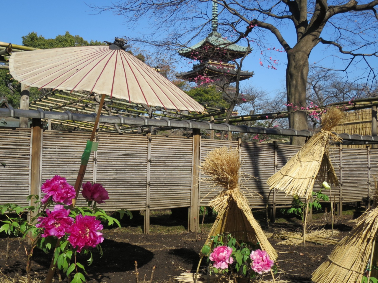 東照宮に併設するぼたん苑は、ぼたんの開花期(1~2月は寒(冬)ぼたん、4~5月は春ぼたん)に有料ですが入園することができます。冬ぼたんの時期は、葉を落とした木々の向こうに透けて、五重塔がよく見えました。