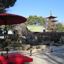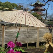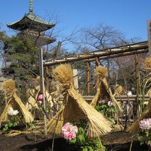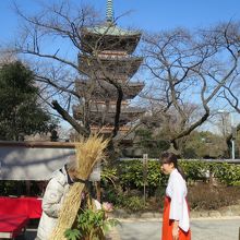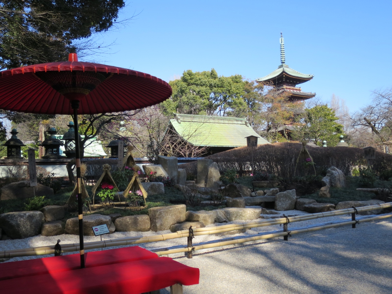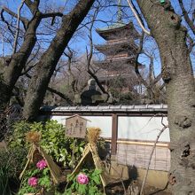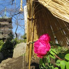桜の時期がきれいですが、何もない冬でもぼたん苑から眺めた五重塔が、寒(冬)ボタンの花の背景にそびえる構図でよかったです。ほのかな艶やかさの冬ボタンの背景に立つ五重塔がとても和の雰囲気に似合っていました。