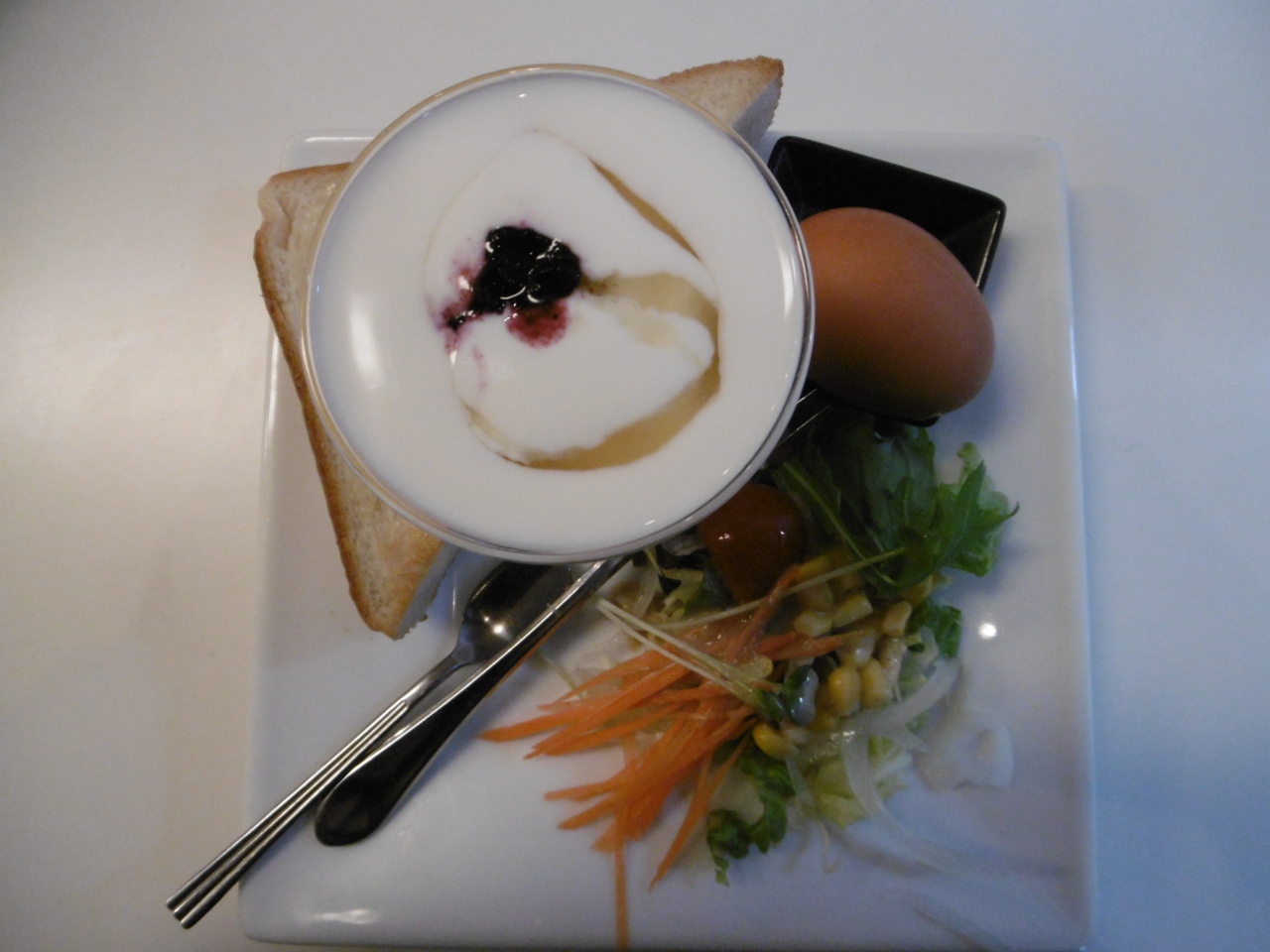 トースト(半分)にサラダと卵、カスピ海ヨーグルトのモーニングでした。
