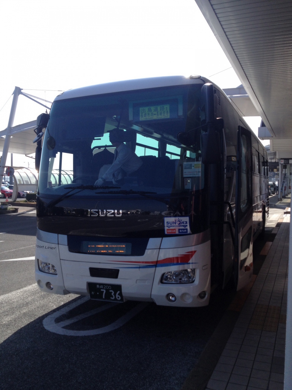 市内までは直通バスでだいたい40分くらい。下の道を通るルートもありますが、本数が多いのは高速道路を通るルートです。