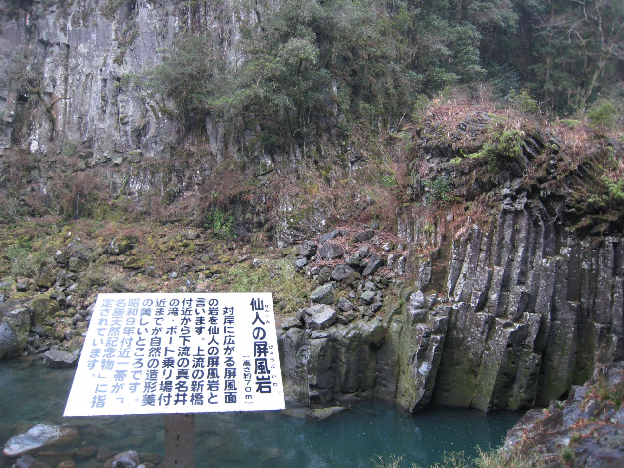 階段を下りていくと遊歩道があり、屏風岩や甌穴などが見られます。