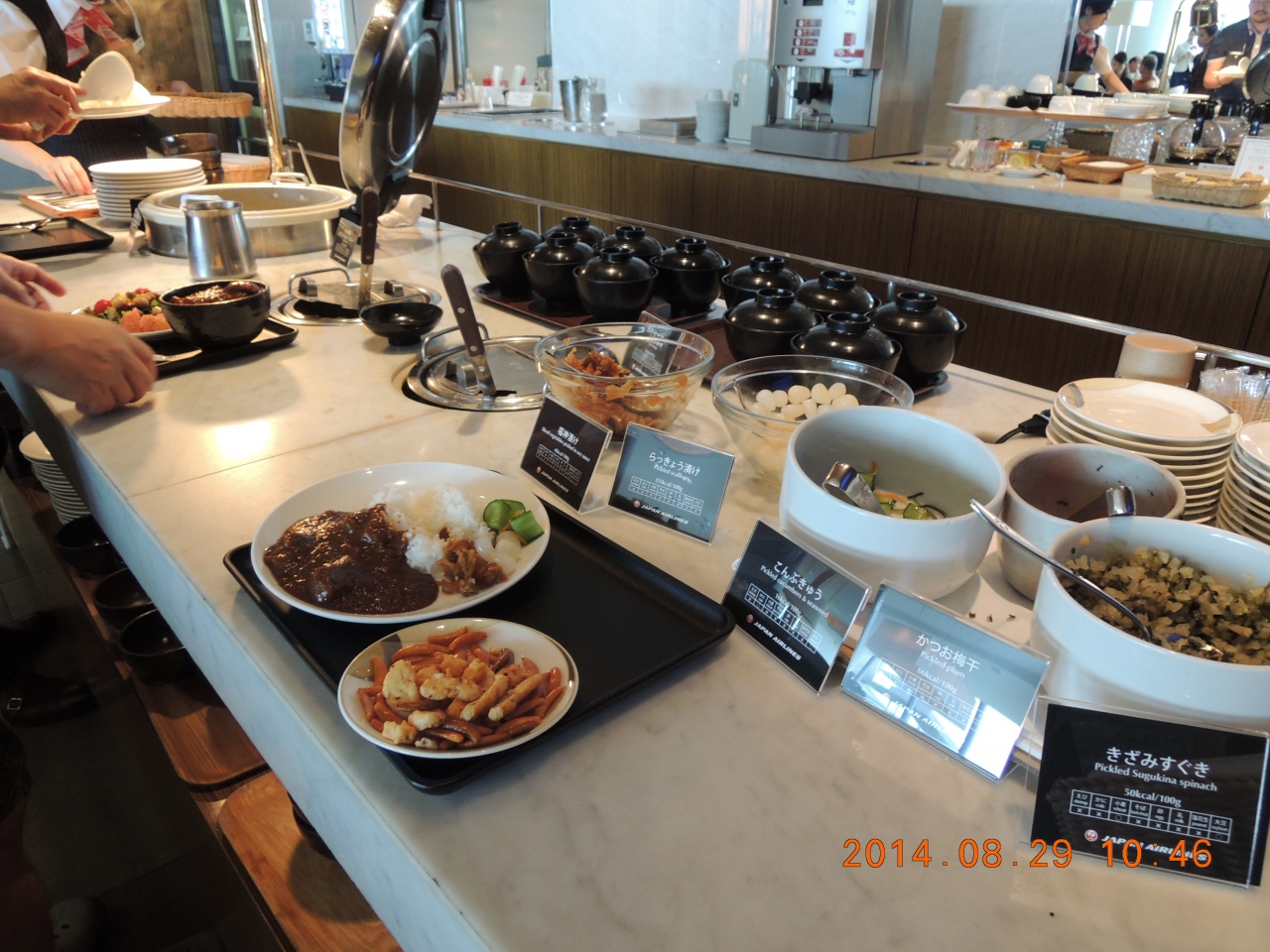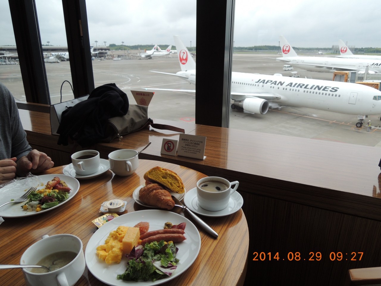 午前11:35の便で出発だったため早めにラウンジに行って食事の階に行ったらブッフェが朝食のメニューでサラダ、ソーセージ、スクランブルエッグなどでした。もしかしたら和食もあったかもしれないです。午前10時までが朝食メニューです。10時からはランチメニューでカレーが美味しかったです。下の階はワインなどのアルコール類やコーヒー、紅茶などのソフトドリンクに柿の種やクラッカー、チーズなどの簡単なおつまみがあって食事と階が分かれています。