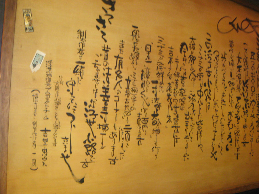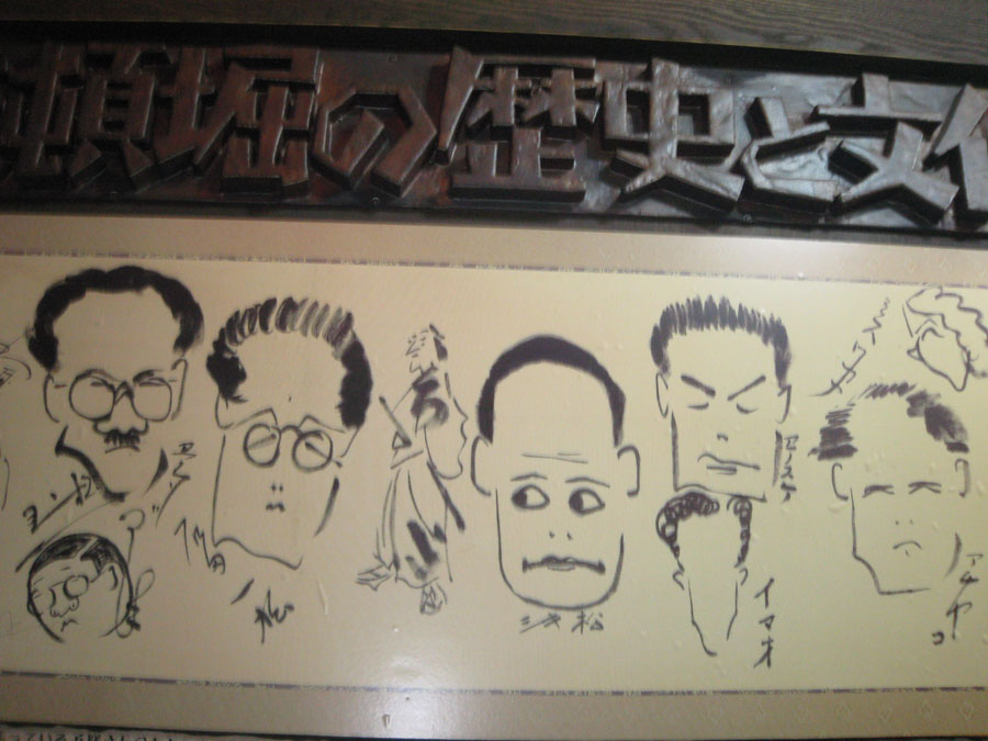 中は提灯が並ぶレトロな空間になっています。小さな神社や昔の風景がイラストで描かれており、桂春団治さんの写真なども展示されています。