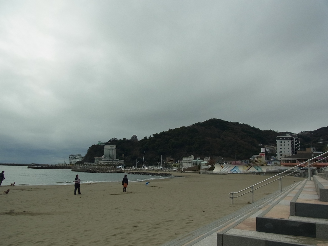 熱海駅から仲見世通り商店街を抜けて、そのまま坂を下っていくとビーチが見えてきます。目の前にコンビニがあったので缶コーヒーを買って散歩。お宮の松などあります。