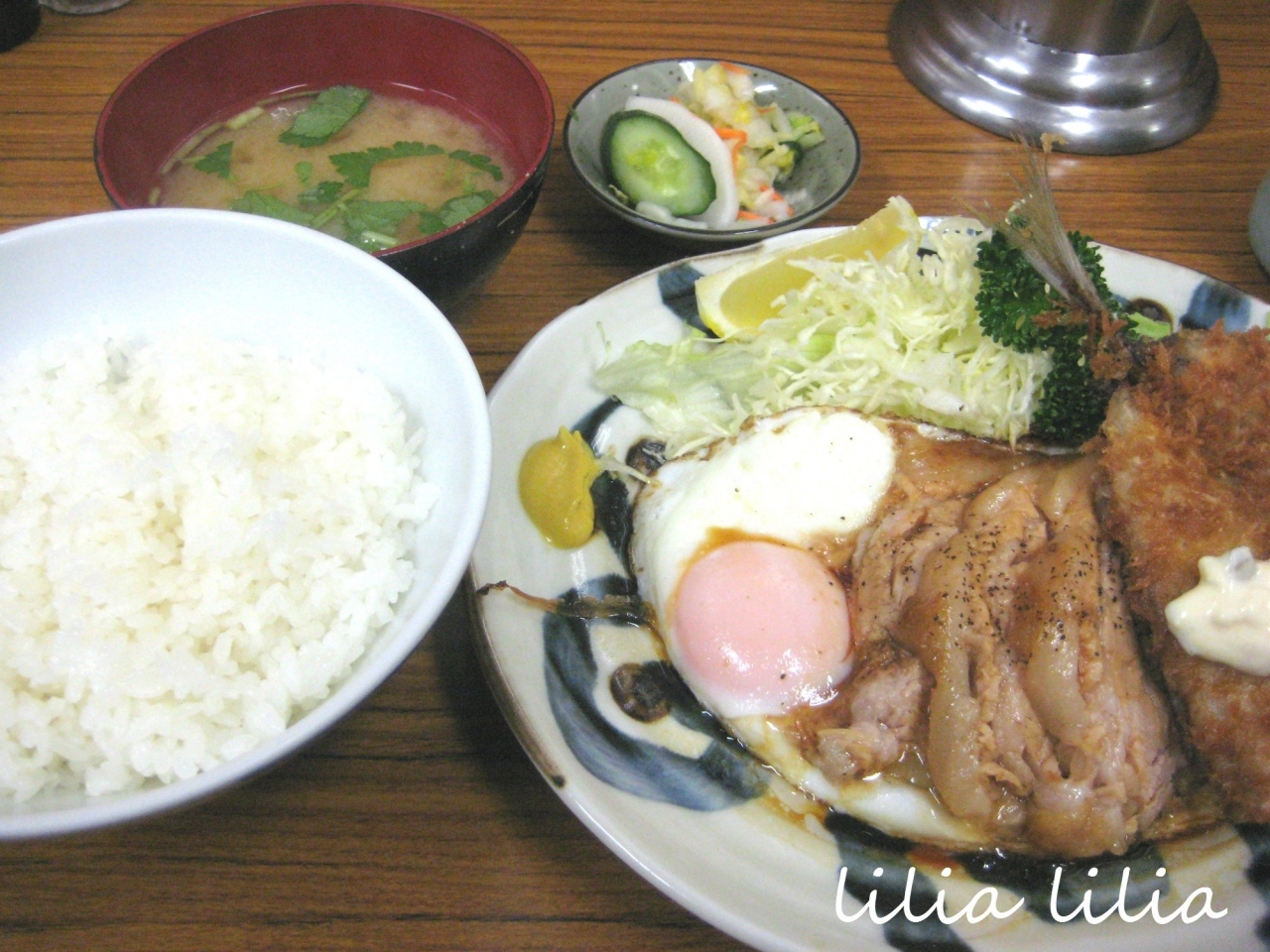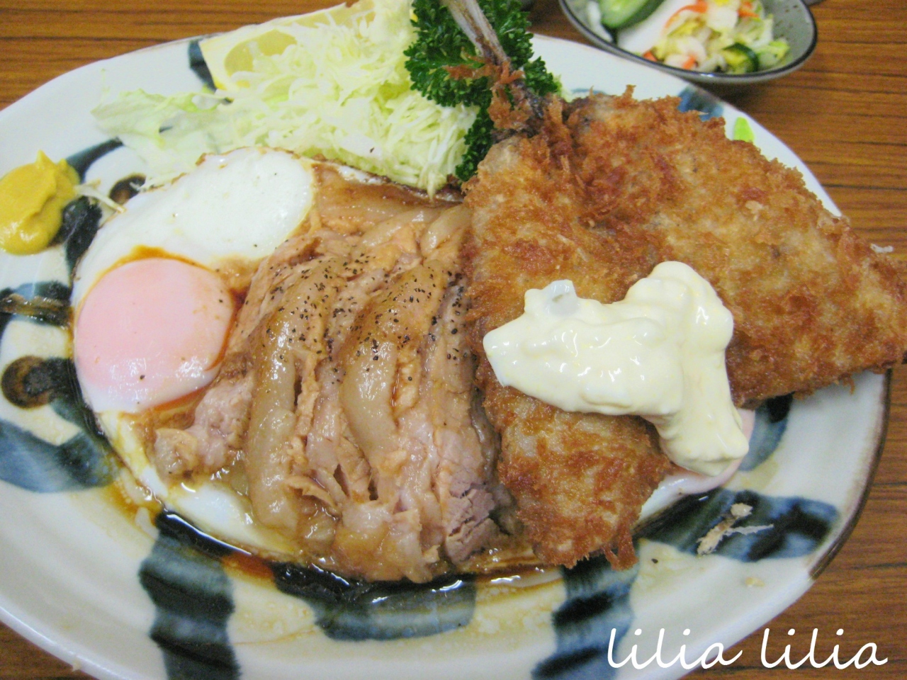でっかいチャーシューに玉子2個の目玉焼きにキャベツの千切りにコールスローサラダにごはん、味噌汁、お新香。