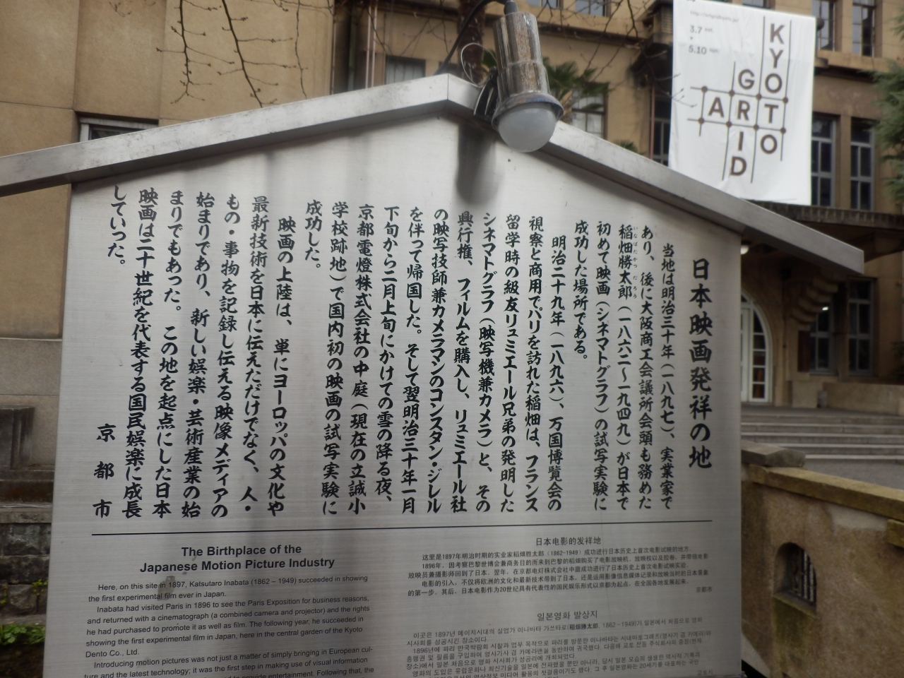 京都の高瀬川を散策していると、日本えいが発祥の地と記した石碑が見つかった、この付近明治維新前後の活躍した人物の碑などが沢山建てられており順に見て回っていると、高瀬川に架かる、紙谷橋、蛸地蔵橋の間に碑がありました。京都市が建てた立札によると、明治30年1月雪の降る夜京都電灯株式会社の中庭で国内初の映画試写実験が成功した、と記されていた(一部略)映画は違和感があったが、京都には映画の撮影所が多数あるのもうなずけます