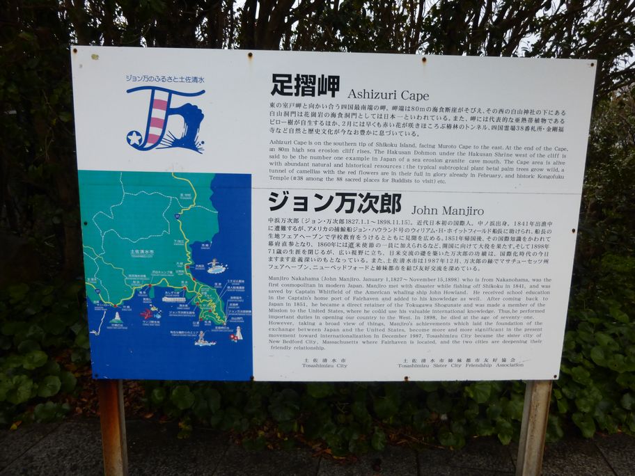 高松で一泊して、讃岐うどんめぐりをしてから、高速で足摺岬へ。計画通り、日暮れ前の17時に到着することができたのですが、生憎この日はずっと雨で夕陽を見ることはできませんでした。ジョン万次郎の像近くの道路沿いに数台分の無料駐車場があり、運よくそこが空いていたので車を停めました。金曜日の夕方でしたが、ほぼ満車に近い状態でした。歩いて展望台まで行きましたが、展望台の端はすごい強風で傘を持って行かれそうでした。展望台からの眺望は、太平洋の水平線が見渡せて雄大な形式でしたが、最近北海道の神威岬に行ったばかりだったし、天気も悪かったので、余り感動を得ることはできませんでした。雨だったので、灯台にも行きませんでした。ジョン万次郎像の近くにトイレもあります。