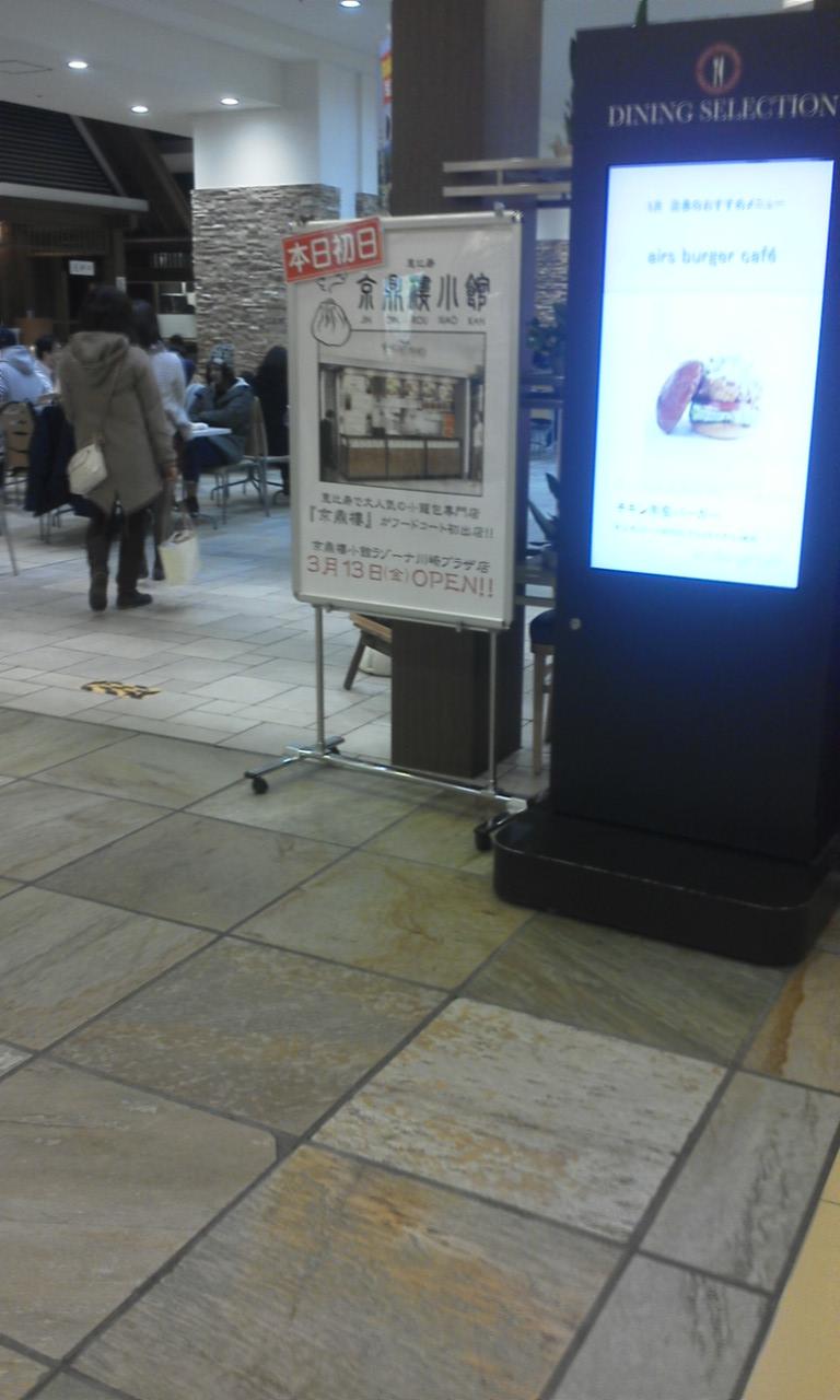 川崎ラゾーナ1階のフードコートは、店舗スタイルはフードコート、セルフサービスですが出店しているお店は結構本格的な料理を出していて、家族で利用する時は重宝します。ちちょうど3月13日に行ったら小籠包専門店『京鼎樓』がフードコートに初出店する時でして、関係者らしき人々が写真撮影していました。