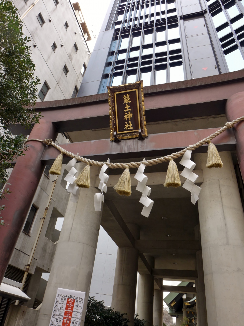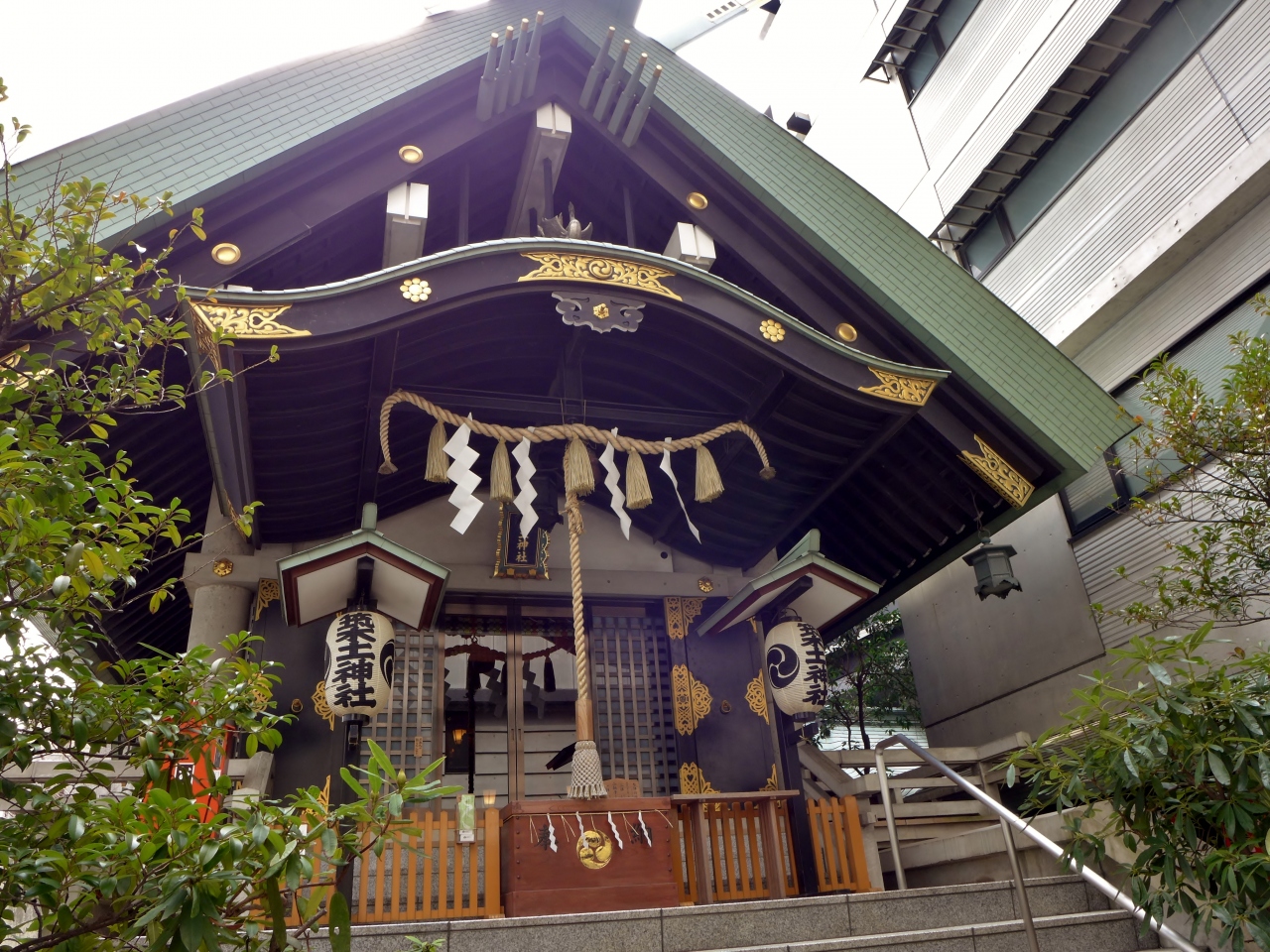 大きな鳥居が立っていますが、おそらくかつて境内だった場所に大きなビルが建ってしまったようで、社殿はビルの下を進んだ奥に窮屈そうにありました。