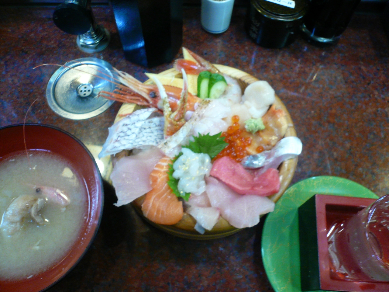 テレビ番組で紹介されることが多い、大名丼(のどぐろ入り海鮮丼)をいただきました。店の提供写真よりちょっと劣る感じはしましたが、可もなく不可もなくです。いつも行列ができているようで、30分ほど待ちました。待っている間にオーダーを入れるので、着席してすぐに料理が運ばれます。元来、回転寿司なのですが、ほとんど直接ーダーするお客さんばかりです。丼もいいですが、旬のネタをお好み握ってもらうのも歓迎されている感じです。