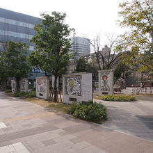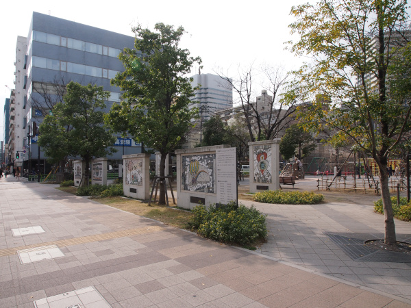 公園内に「平和の広場」が有り、中央区による「平和のモニュメント」8基が立っています。区内の小学校16校の児童が作成した原画を基にしたモザイク16枚が取り付けられています。「平和を願い核兵器のない世界の実現」をテーマとしているそうです。私は「核兵器のない世界」は無理だと思いますが。
