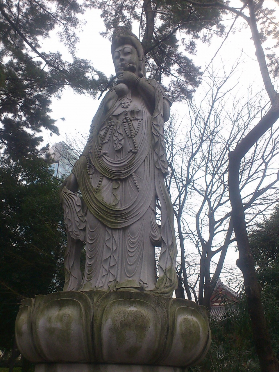 増上寺の三解脱門をくぐって左側、水盤舎の後ろ側あたりにあります。最初は何でこんなところに観音像があるのか不思議でしたが、説明を読むと、1982年に起きたホテルニュージャパンの大火災で犠牲になられた33名の方を供養するために建てられたものだそうです。