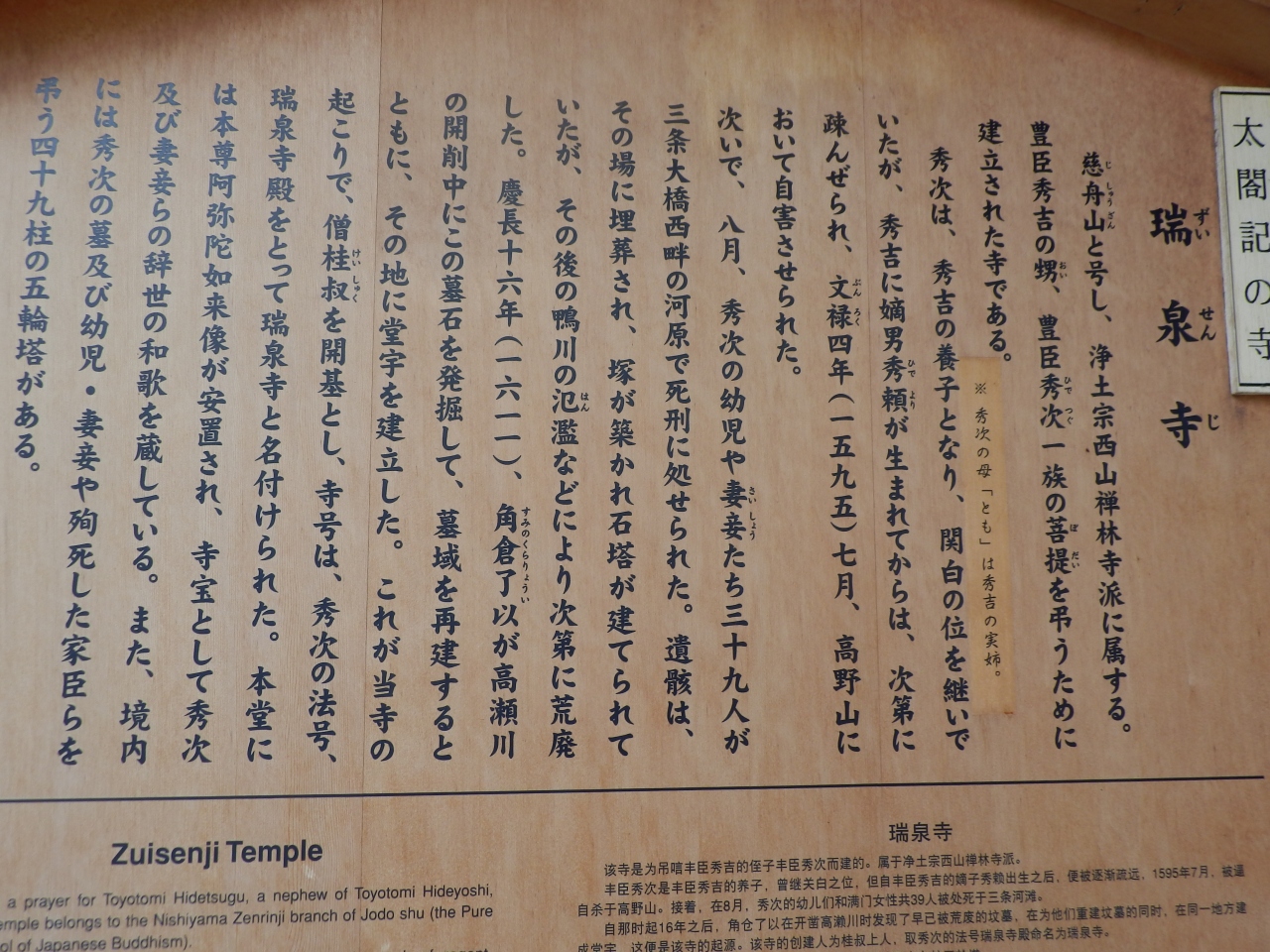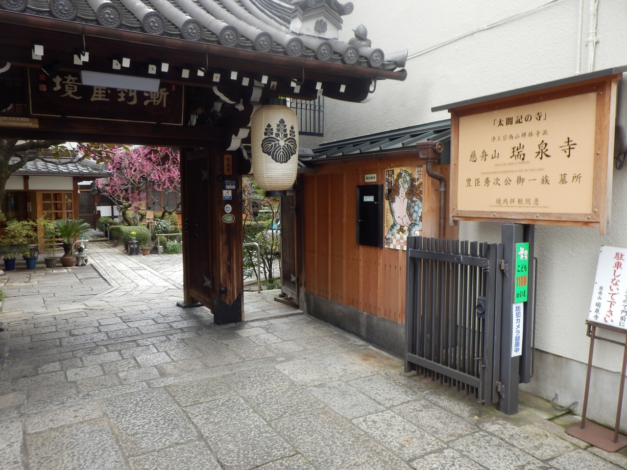 京都の市内を南北に流れている高瀬川に沿って北上すると三条通にでる、ここに高瀬川に架かる三条小橋がある、この東側にあるお寺。由来が記された立札によると,慈船山と号浄土宗西山禅林寺に属する。豊臣秀吉の甥、豊臣秀次一族の菩提を弔うために建立された寺である。以下略。お寺の門前に立札があり由来などが簡潔に記されており大変重宝しました、詳細は添付写真を参照