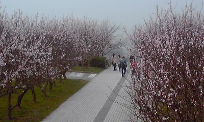 山頂へ向かう道や階段の周りはすでに杏の花が満開で、多くの人でにぎわっていました。