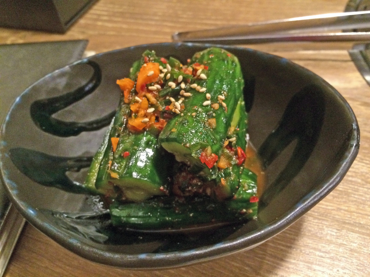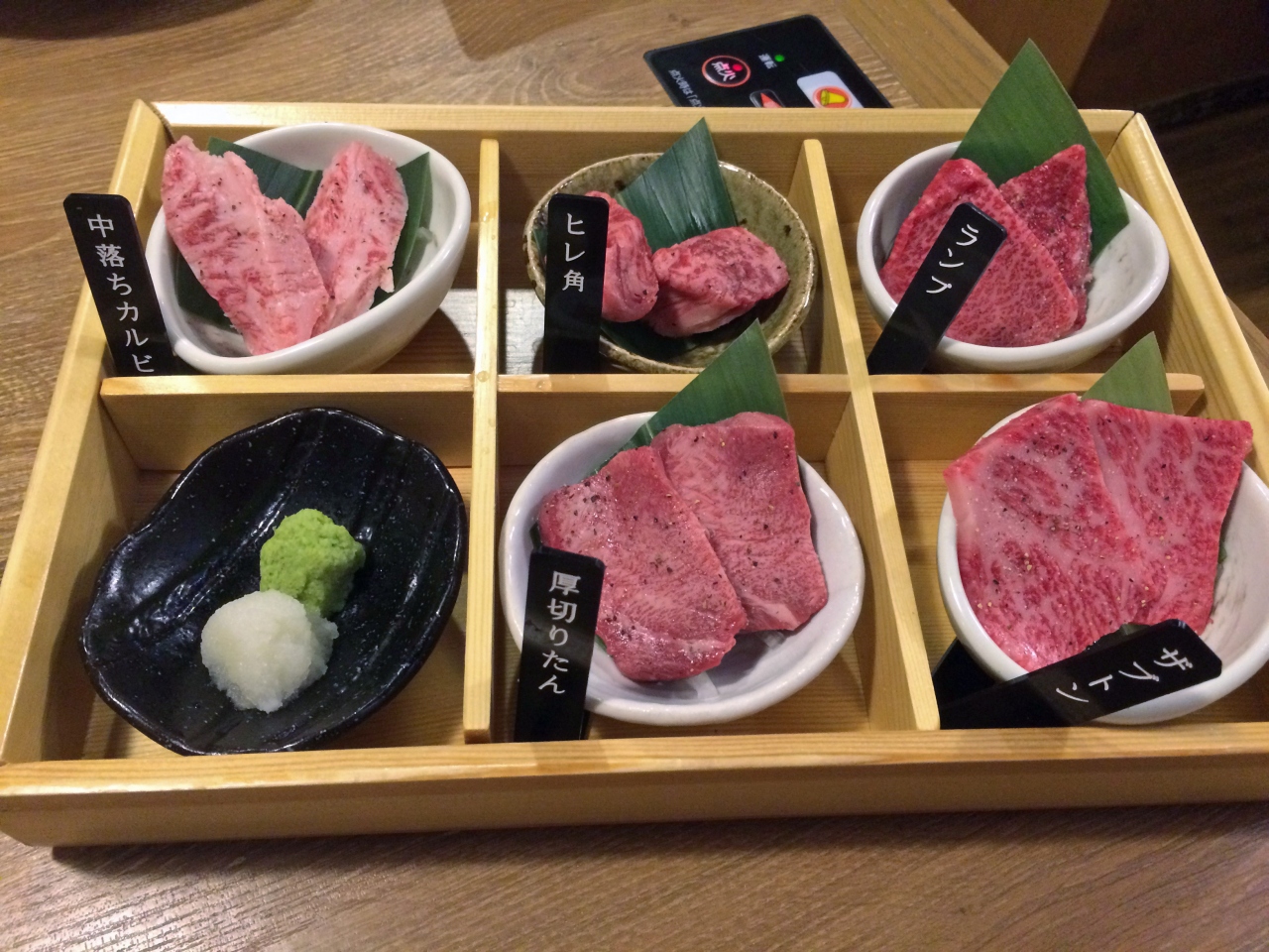 焼肉問屋 くに家 パサージオ店の看板メニューは、くに家5点盛り。中落ちカルビ、ひれ角、ランプ、厚切りタン、ザブトンを軽く焼いて、わさび醤油でいただく。一寸贅沢な逸品だ。