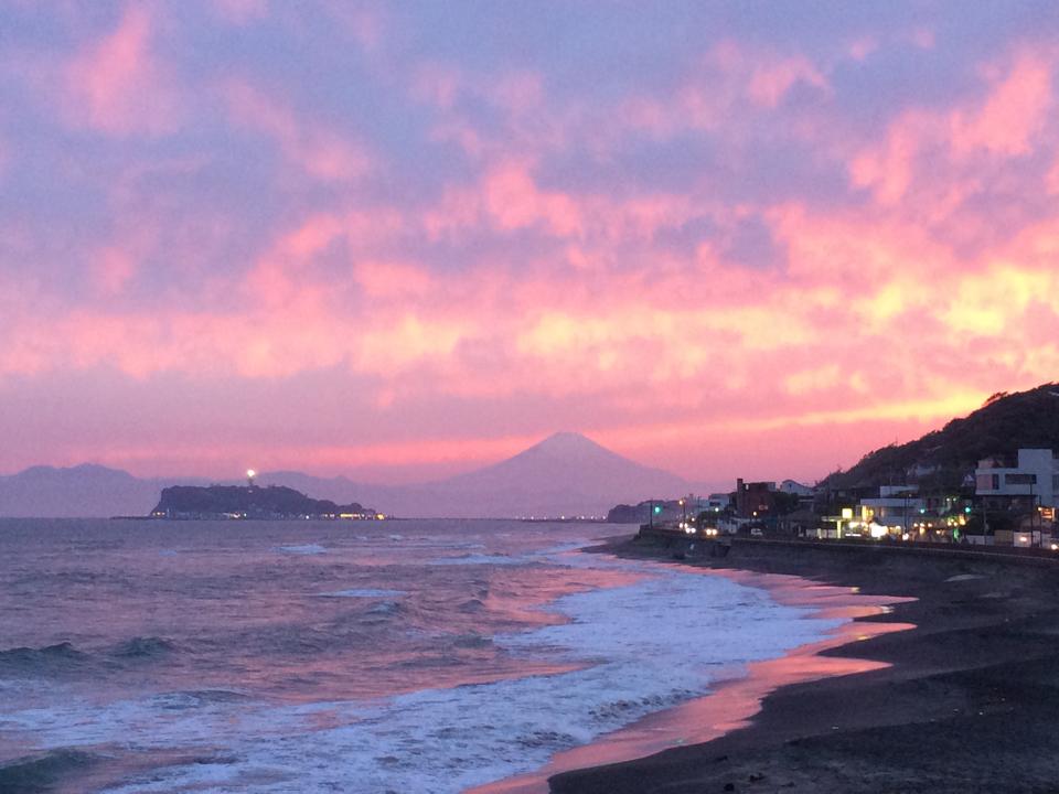 鎌倉を訪れる時はいつも神社仏閣をあちこち歩き回って花を愛でお参りをして、締めくくりに稲村ガ崎で夕暮れ時を迎えます。夕焼けがとても美しく、富士山が見えると、お参りのご利益かな…とうれしくなります。海と空と江ノ島と富士山、なんとも絵になります!!