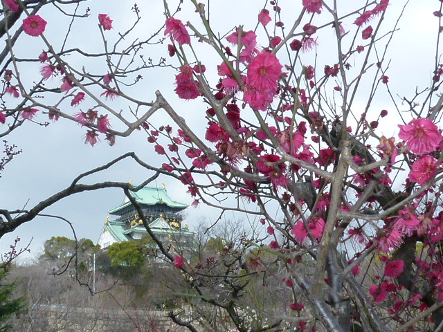 今日は良い天気です。大阪城の梅林を観にきました。大勢のお客様を迎えるかのように、お梅さん、もオメカシしています。梅林は大阪城公園内にあり、どちらか言うと東側にありますので、京阪ならば京橋駅、JRならば大阪城公園駅、森の宮が良いでしょう。大きなカメラで足の長い三脚を持った、プロに無理に挑戦している素人らしきおじさん達がシャッターをガシャガシャ音をたてて撮っています。トイレや休憩場所もあります。大阪城をバックにあなたも撮影下さいね。