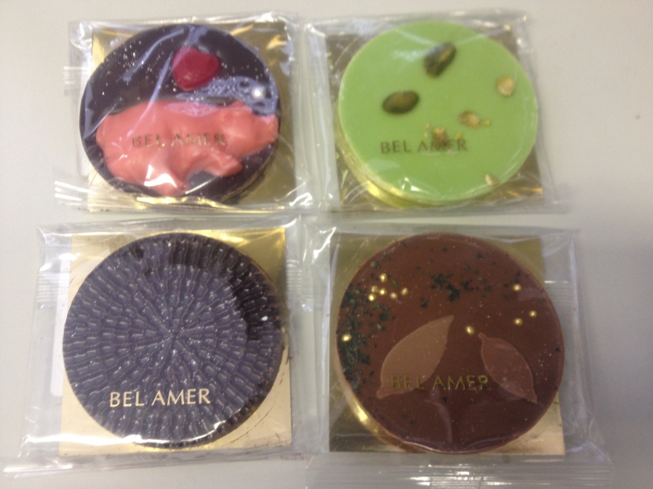 前々から気になっていた丸い板チョコにかわいいトッピングがついてるチョコのベルアメール。このお店は東京駅の横の大丸なので、よりやすく、お土産買うのに便利です。選ぶのも楽しいチョコです。が、私は塩とほうじ茶を試したのですが、ほとんど風味が感じられず、残念。二つしか食べていないので、選択なのか、私の好みなのかもしれないです。