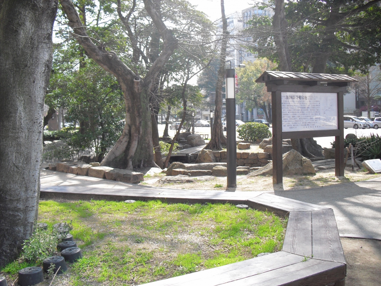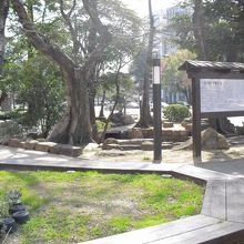 白神社という神社の目の前、平和大通り沿いの歩道になっている部分に小さな池の跡があります。江戸時代に広島藩の菩提寺であった国泰寺があった場所の一部です。