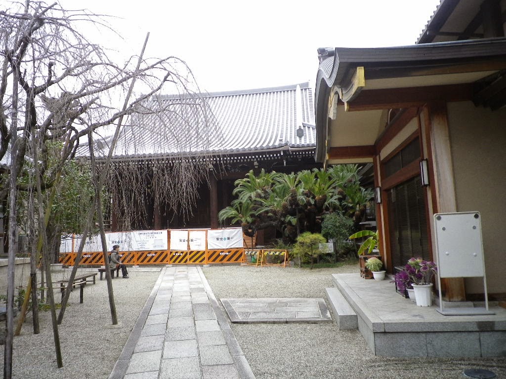 三条通り沿いにありました。まず目を惹いたのは大きなソテツ。寺院にソテツというのはあまり見たことがありません。また、春を待っている枝垂桜。こちらも開くとさぞかしきれいなことでしょう。工事中であったのがやや残念でした。