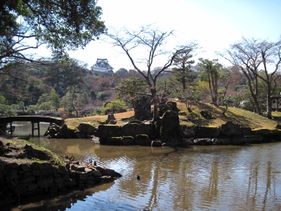 庭内に八景亭という江戸時代の建物を利用した料理旅館があり、天守閣を背景にした茅葺き屋根が池に映ってとても雰囲気があります。