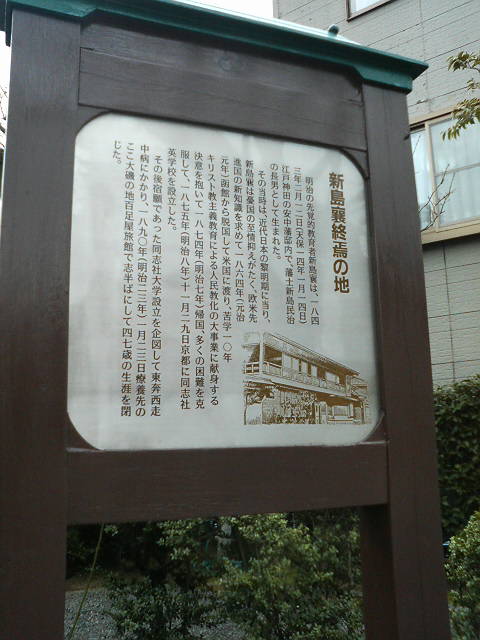 大隈重信、福沢諭吉とともに明治の三大教育家として有名な人物で、同志社大学の前身である同志社英学校を開設したものの、その後、かつてこの地にあった「百足屋旅館」で療養していたとのこと。