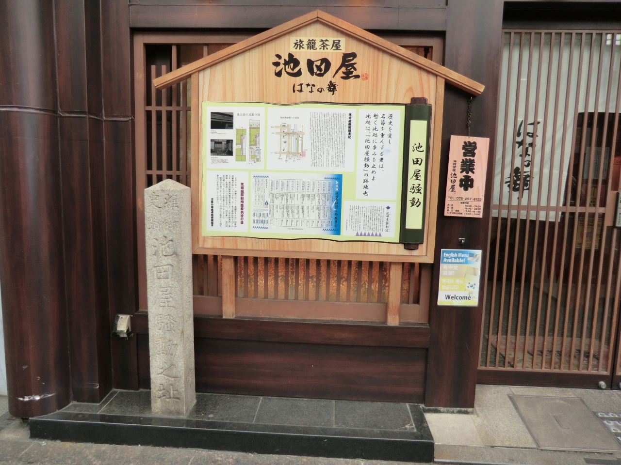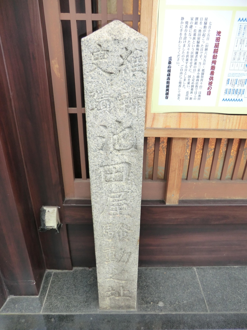 新撰組を語る上では一番有名な事件の址ですが、今は碑と、現在のお店が設置した案内板があるのみです。ここ池田屋跡の店舗はよく変わったのですが、今は現在の飲食店で落ち着いているようですね。石碑のみとはいえ、新撰組に興味のある人は一度は訪れたい所だと思います。
