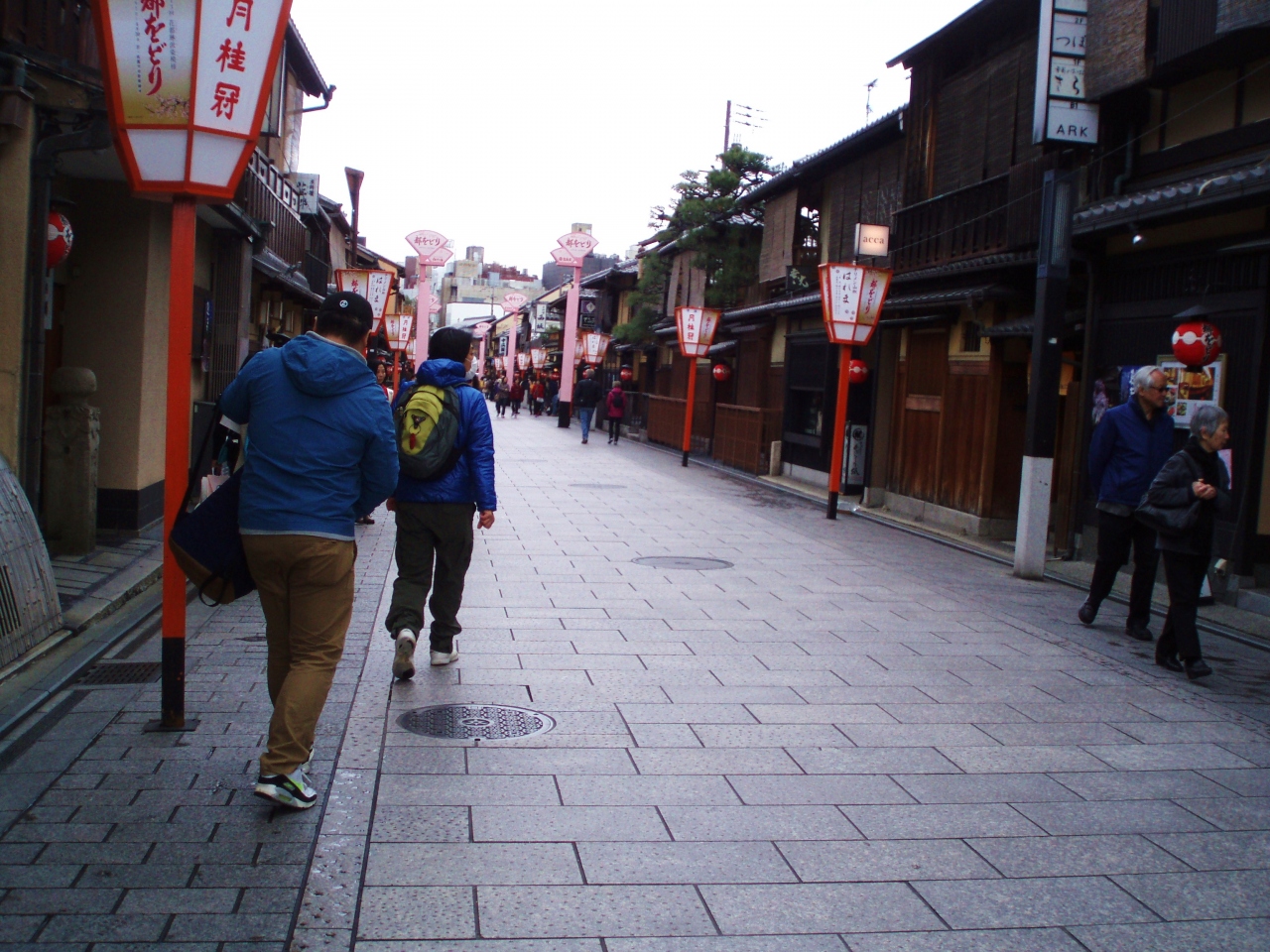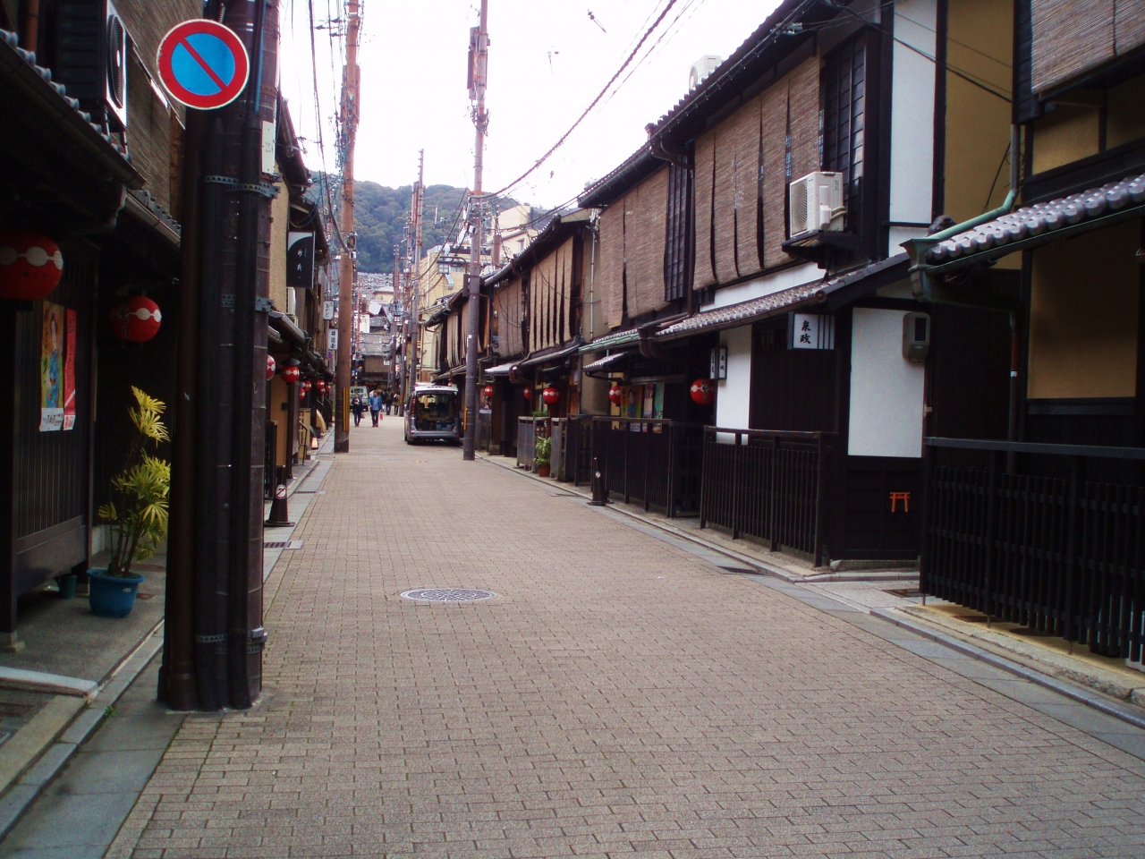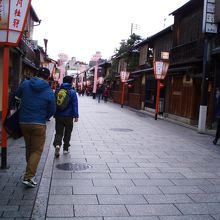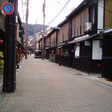 祇園四条界隈の人ごみの少し先の小道の石畳の道に、京都の町屋の町並みが