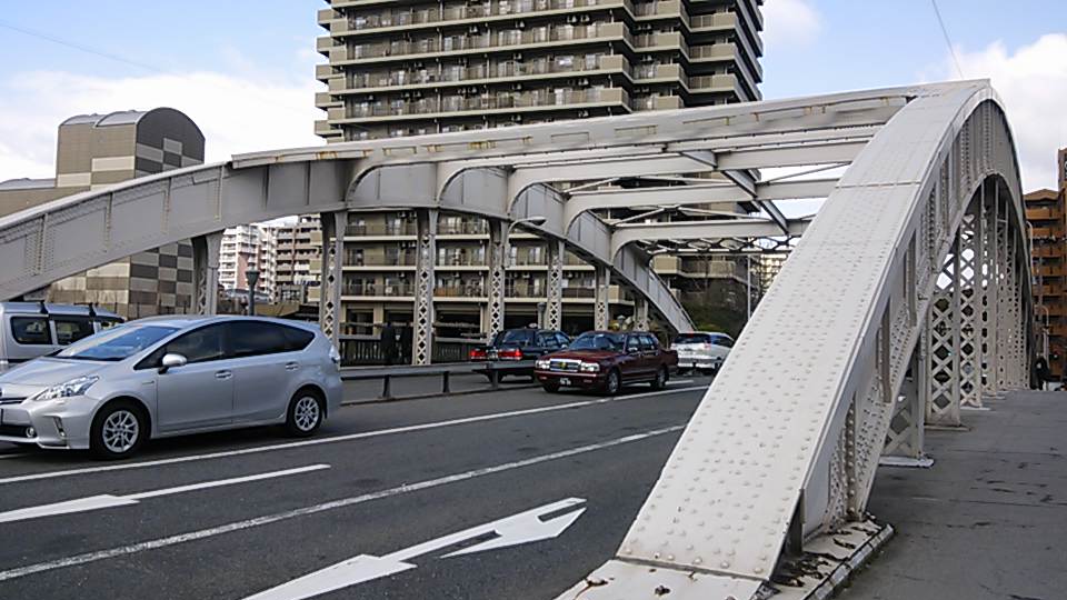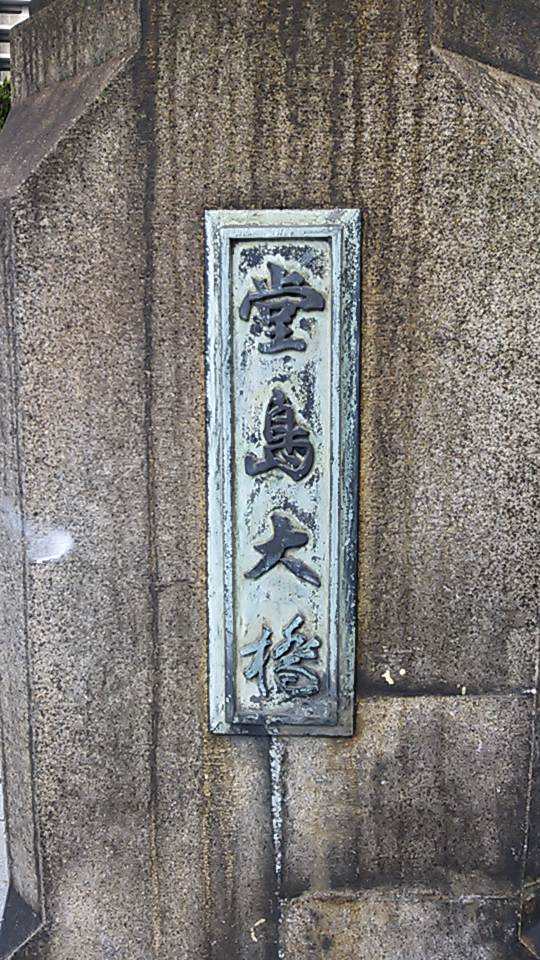 交通量の多い、大きなアーチ状の橋です。夜には季節ごとの限定カラーでライトアップされます。両端の歩行者が通る部分には、石の欄干が残っています。橋名板には「どう志ま於ほはし」と読めます。変体仮名が時代を感じさせます。